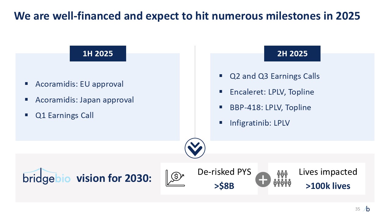We are well-financed and expect to hit numerous milestones in 2025  vision for 2030:  >$8B   De-risked PYS  >100k lives   Lives impacted  Acoramidis: EU approval  Acoramidis: Japan approval  Q1 Earnings Call  Q2 and Q3 Earnings Calls  Encaleret: LPLV, Topline  BBP-418: LPLV, Topline  Infigratinib: LPLV  +  1H 2025  2H 2025