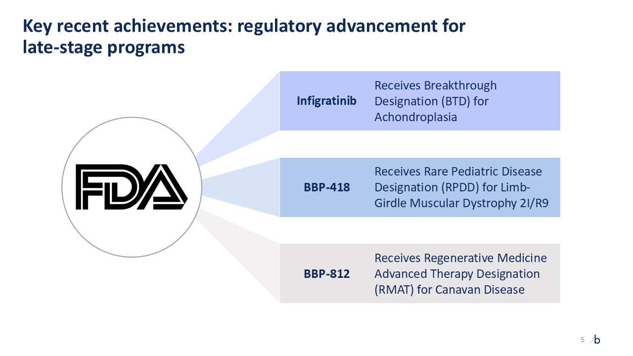 Key recent achievements: regulatory advancement for late-stage programs  Receives Breakthrough Designation (BTD) for Achondroplasia  Receives Rare Pediatric Disease Designation (RPDD) for Limb-Girdle Muscular Dystrophy 2I/R9  Receives Regenerative Medicine Advanced Therapy Designation (RMAT) for Canavan Disease  Infigratinib   BBP-418  BBP-812