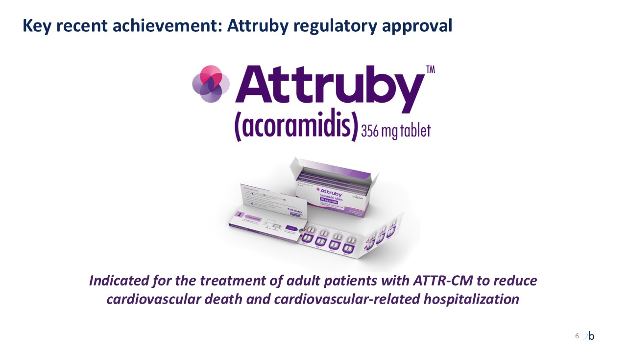 Key recent achievement: Attruby regulatory approval  Indicated for the treatment of adult patients with ATTR-CM to reduce cardiovascular death and cardiovascular-related hospitalization