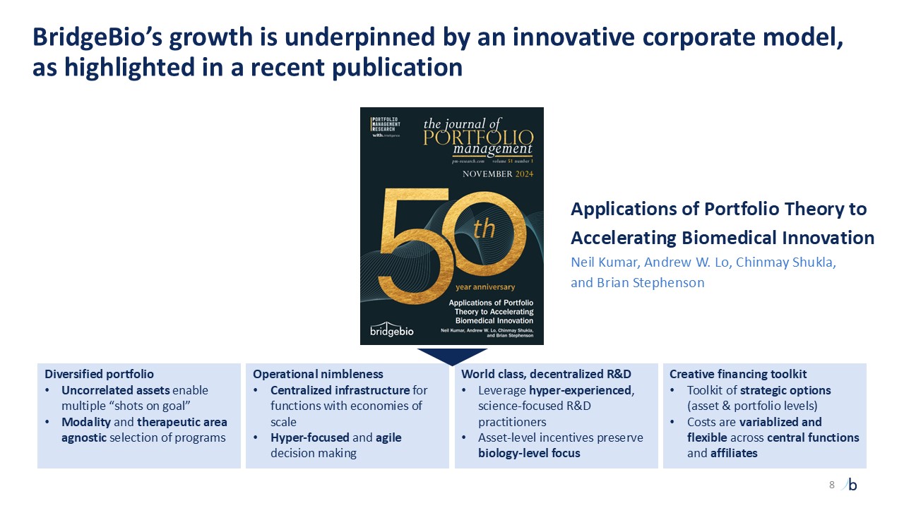 BridgeBio’s growth is underpinned by an innovative corporate model, as highlighted in a recent publication  Applications of Portfolio Theory to Accelerating Biomedical Innovation  Neil Kumar, Andrew W. Lo, Chinmay Shukla,and Brian Stephenson  Operational nimbleness  Centralized infrastructure for functions with economies of scale   Hyper-focused and agile decision making  Creative financing toolkit  Toolkit of strategic options (asset & portfolio levels)  Costs are variablized and flexible across central functions and affiliates  World class, decentralized R&D  Leverage hyper-experienced, science-focused R&D practitioners  Asset-level incentives preserve biology-level focus  Diversified portfolio  Uncorrelated assets enable multiple “shots on goal”  Modality and therapeutic area agnostic selection of programs