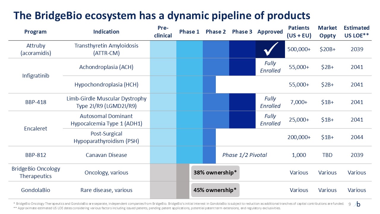 The BridgeBio ecosystem has a dynamic pipeline of products  Program  Indication  Pre-clinical  Phase 1  Phase 2  Phase 3  Approved  Patients  (US + EU)  Market Oppty  Estimated US LOE**  Attruby  (acoramidis)  Transthyretin Amyloidosis   (ATTR-CM)  500,000+  $20B+  2039  Infigratinib  Achondroplasia (ACH)  Fully Enrolled  55,000+  $2B+  2041  Hypochondroplasia (HCH)  55,000+  $2B+  2041  BBP-418  Limb-Girdle Muscular Dystrophy   Type 2I/R9 (LGMD2I/R9)  Fully Enrolled  7,000+  $1B+  2041  Encaleret  Autosomal Dominant Hypocalcemia Type 1 (ADH1)  Fully Enrolled  25,000+  $1B+  2041  Post-Surgical   Hypoparathyroidism (PSH)  200,000+  $1B+  2044  BBP-812  Canavan Disease  1,000  TBD  2039  BridgeBio Oncology Therapeutics  Oncology, various  Various  Various  Various  GondolaBio  Rare disease, various  Various  Various  Various    Phase 1/2 Pivotal  45% ownership*  38% ownership*  * BridgeBio Oncology Therapeutics and GondolaBio are separate, independent companies from BridgeBio. BridgeBio’s initial interest in GondolaBio is subject to reduction as additional tranches of capital contributions are funded.  ** Approximate estimated US LOE dates considering various factors including issued patents, pending patent applications, potential patent term extensions, and regulatory exclusivities.