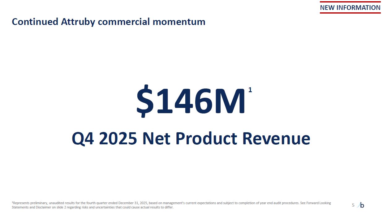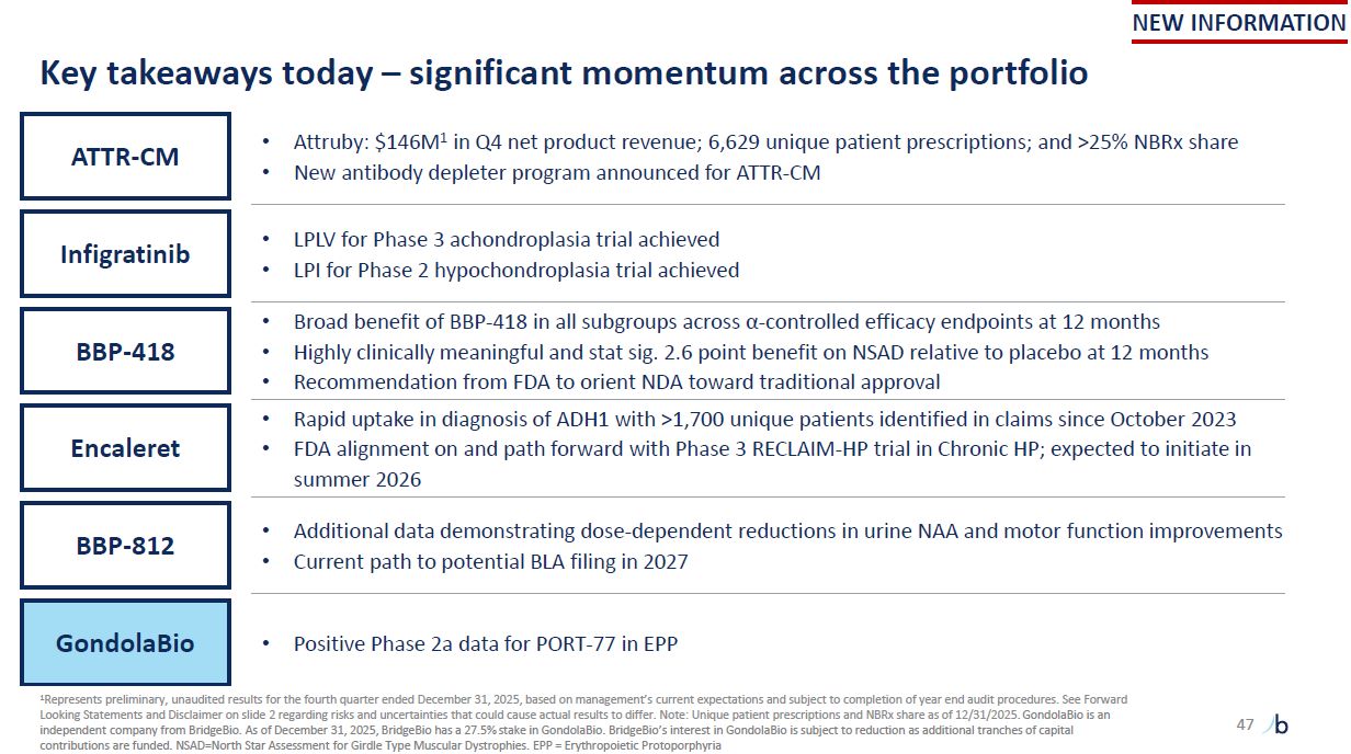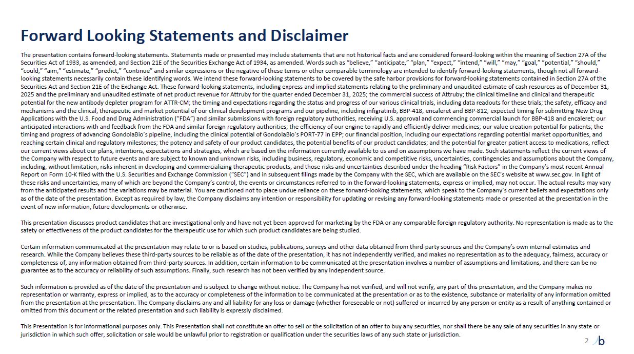 Forward Looking Statements and Disclaimer  The presentation contains forward-looking statements. Statements made or presented may include statements that are not historical facts and are considered forward-looking within the meaning of Section 27A of the Securities Act of 1933, as amended, and Section 21E of the Securities Exchange Act of 1934, as amended. Words such as “believe,” “anticipate,” “plan,” “expect,” “intend,” “will,” “may,” “goal,” “potential,” “should,” “could,” “aim,” “estimate,” “predict,” “continue” and similar expressions or the negative of these terms or other comparable terminology are intended to identify forward-looking statements, though not all forward-looking statements necessarily contain these identifying words. We intend these forward-looking statements to be covered by the safe harbor provisions for forward-looking statements contained in Section 27A of the Securities Act and Section 21E of the Exchange Act. These forward-looking statements, including express and implied statements relating to the preliminary and unaudited estimate of cash resources as of December 31, 2025 and the preliminary and unaudited estimate of net product revenue for Attruby for the quarter ended December 31, 2025; the commercial success of Attruby; the clinical timeline and clinical and therapeutic potential for the new antibody depleter program for ATTR-CM; the timing and expectations regarding the status and progress of our various clinical trials, including data readouts for these trials; the safety, efficacy and mechanisms and the clinical, therapeutic and market potential of our clinical development programs and our pipeline, including infigratinib, BBP-418, encaleret and BBP-812; expected timing for submitting New Drug Applications with the U.S. Food and Drug Administration (“FDA”) and similar submissions with foreign regulatory authorities, receiving U.S. approval and commencing commercial launch for BBP-418 and encaleret; our anticipated interactions with and feedback from the FDA and similar foreign regulatory authorities; the efficiency of our engine to rapidly and efficiently deliver medicines; our value creation potential for patients; the timing and progress of advancing GondolaBio’s pipeline, including the clinical potential of GondolaBio’s PORT-77 in EPP; our financial position, including our expectations regarding potential market opportunities, and reaching certain clinical and regulatory milestones; the potency and safety of our product candidates, the potential benefits of our product candidates; and the potential for greater patient access to medications, reflect our current views about our plans, intentions, expectations and strategies, which are based on the information currently available to us and on assumptions we have made. Such statements reflect the current views of the Company with respect to future events and are subject to known and unknown risks, including business, regulatory, economic and competitive risks, uncertainties, contingencies and assumptions about the Company, including, without limitation, risks inherent in developing and commercializing therapeutic products, and those risks and uncertainties described under the heading “Risk Factors” in the Company’s most recent Annual Report on Form 10-K filed with the U.S. Securities and Exchange Commission (“SEC”) and in subsequent filings made by the Company with the SEC, which are available on the SEC’s website at www.sec.gov. In light of these risks and uncertainties, many of which are beyond the Company’s control, the events or circumstances referred to in the forward-looking statements, express or implied, may not occur. The actual results may vary from the anticipated results and the variations may be material. You are cautioned not to place undue reliance on these forward-looking statements, which speak to the Company’s current beliefs and expectations only as of the date of the presentation. Except as required by law, the Company disclaims any intention or responsibility for updating or revising any forward-looking statements made or presented at the presentation in the event of new information, future developments or otherwise.  This presentation discusses product candidates that are investigational only and have not yet been approved for marketing by the FDA or any comparable foreign regulatory authority. No representation is made as to the safety or effectiveness of the product candidates for the therapeutic use for which such product candidates are being studied.  Certain information communicated at the presentation may relate to or is based on studies, publications, surveys and other data obtained from third-party sources and the Company’s own internal estimates and research. While the Company believes these third-party sources to be reliable as of the date of the presentation, it has not independently verified, and makes no representation as to the adequacy, fairness, accuracy or completeness of, any information obtained from third-party sources. In addition, certain information to be communicated at the presentation involves a number of assumptions and limitations, and there can be no guarantee as to the accuracy or reliability of such assumptions. Finally, such research has not been verified by any independent source.  Such information is provided as of the date of the presentation and is subject to change without notice. The Company has not verified, and will not verify, any part of this presentation, and the Company makes no representation or warranty, express or implied, as to the accuracy or completeness of the information to be communicated at the presentation or as to the existence, substance or materiality of any information omitted from the presentation at the presentation. The Company disclaims any and all liability for any loss or damage (whether foreseeable or not) suffered or incurr