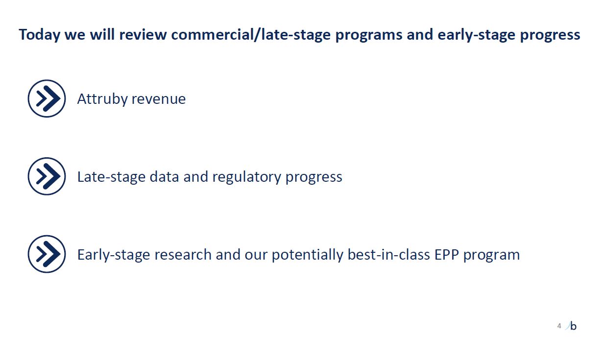 Today we will review commercial/late-stage programs and early-stage progress  4  Attruby revenue  Late-stage data and regulatory progress  Early-stage research and our potentially best-in-class EPP program