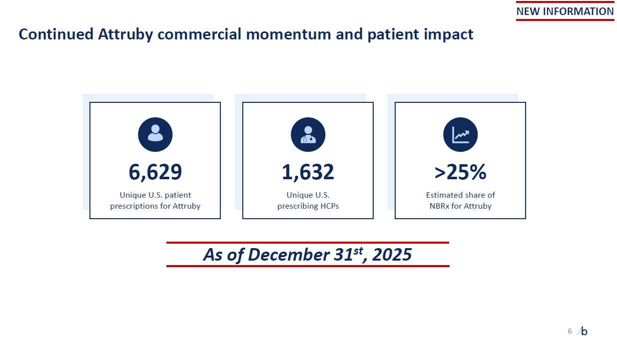 Continued Attruby commercial momentum and patient impact  6  6,629  Unique U.S. patient prescriptions for Attruby  1,632  Unique U.S. prescribing HCPs  >25%  Estimated share of NBRx for Attruby  As of December 31st, 2025  NEW INFORMATION