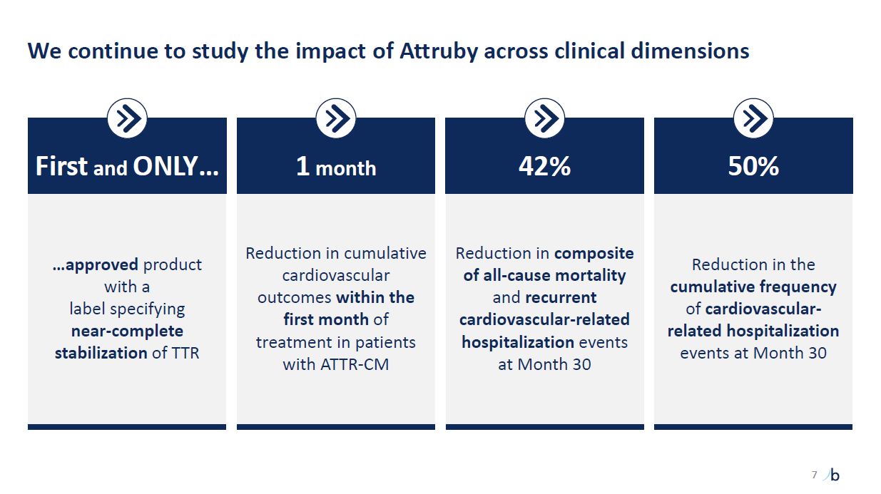We continue to study the impact of Attruby across clinical dimensions  …approved product with a  label specifying near-complete stabilization of TTR  First and ONLY…  Reduction in cumulative cardiovascular outcomes within the first month of treatment in patients with ATTR-CM  1 month  Reduction in composite of all-cause mortality and recurrent cardiovascular-related hospitalization events at Month 30  42%  Reduction in the cumulative frequency of cardiovascular-related hospitalization events at Month 30  50%  7