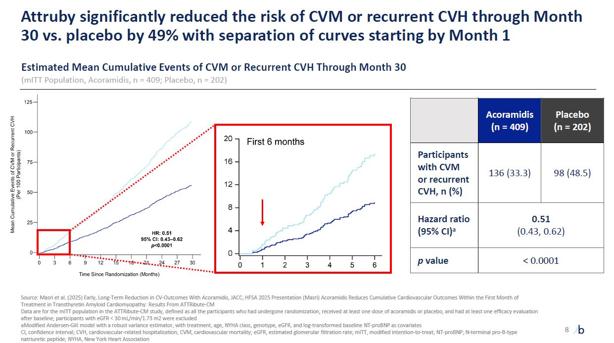 Attruby significantly reduced the risk of CVM or recurrent CVH through Month 30 vs. placebo by 49% with separation of curves starting by Month 1  Estimated Mean Cumulative Events of CVM or Recurrent CVH Through Month 30  (mITT Population, Acoramidis, n = 409; Placebo, n = 202)  Acoramidis  (n = 409)  Placebo  (n = 202)  Participants with CVM or recurrent CVH, n (%)  136 (33.3)  98 (48.5)  Hazard ratio  (95% CI)a  0.51  (0.43, 0.62)  p value  < 0.0001  Source: Masri et al. (2025) Early, Long-Term Reduction in CV-Outcomes With Acoramidis, JACC; HFSA 2025 Presentation (Masri) Acoramidis Reduces Cumulative Cardiovascular Outcomes Within the First Month of Treatment in Transthyretin Amyloid Cardiomyopathy: Results From ATTRibute-CM  Data are for the mITT population in the ATTRibute-CM study, defined as all the participants who had undergone randomization, received at least one dose of acoramidis or placebo, and had at least one efficacy evaluation after baseline; participants with eGFR < 30 mL/min/1.73 m2 were excluded  aModified Andersen-Gill model with a robust variance estimator, with treatment, age, NYHA class, genotype, eGFR, and log-transformed baseline NT-proBNP as covariates  CI, confidence interval; CVH, cardiovascular-related hospitalization; CVM, cardiovascular mortality; eGFR, estimated glomerular filtration rate; mITT, modified intention-to-treat; NT-proBNP; N-terminal pro-B-type natriuretic peptide; NYHA, New York Heart Association  8