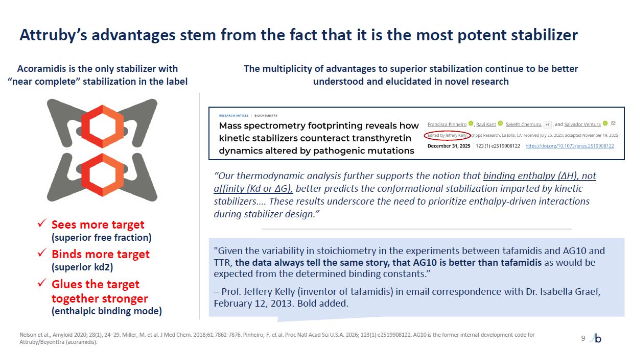 Attruby’s advantages stem from the fact that it is the most potent stabilizer  9  Nelson et al., Amyloid 2020; 28(1), 24–29. Miller, M. et al. J Med Chem. 2018;61:7862-7876. Pinheiro, F. et al. Proc Natl Acad Sci U.S.A. 2026; 123(1) e2519908122. AG10 is the former internal development code for Attruby/Beyonttra (acoramidis).  Sees more target  (superior free fraction)  Binds more target  (superior kd2)  Glues the target together stronger  (enthalpic binding mode)  “Our thermodynamic analysis further supports the notion that binding enthalpy (ΔH), not affinity (Kd or ΔG), better predicts the conformational stabilization imparted by kinetic stabilizers…. These results underscore the need to prioritize enthalpy-driven interactions during stabilizer design.”  Acoramidis is the only stabilizer with “near complete” stabilization in the label  The multiplicity of advantages to superior stabilization continue to be better understood and elucidated in novel research  “Given the variability in stoichiometry in the experiments between tafamidis and AG10 and TTR, the data always tell the same story, that AG10 is better than tafamidis as would be expected from the determined binding constants.”  – Prof. Jeffery Kelly (inventor of tafamidis) in email correspondence with Dr. Isabella Graef, February 12, 2013. Bold added.