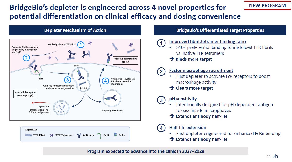 Liver  TTR  Tetramer  Misfolded amyloidogenic monomer  TTR Fibril  Restrictive cardiomyopathy via TTR  fibril deposition  Along with work on Attruby, BridgeBio has initiated a depleter program to explore the potential of ATTR-CM disease reversal  10  Source: Wanniarachchige et al., 2025  Attr  uby  Near-complete stabilizer that prevents dissociation of TTR tetramers into monomers  Depl  eter  Monoclonal antibody that clears existing amyloid deposits via macrophage-mediated phagocytosis  Dr. Richard Scheller  Former Professor, Stanford  Former CSO, Genentech  Former EVP and Executive Committee, Roche Genentech  Chairman of R&D, BridgeBio  ATTR-CM Disease Pathophysiology  Led by Renowned Antibody Expert  NEW PROGRAM  Existing TTR therapies target upstream …but unmet need remains for patients with existing tetramer stabilization and synthesis… amyloid deposits for downstream clearance