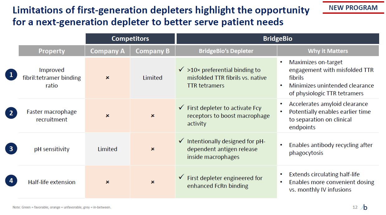 11  BridgeBio’s depleter is engineered across 4 novel properties for potential differentiation on clinical efficacy and dosing convenience  1  2  3  4  Depleter Mechanism of Action  BridgeBio’s Differentiated Target Properties  Improved fibril:tetramer binding ratio  >10× preferential binding to misfolded TTR fibrils vs. native TTR tetramers   Binds more target  Faster macrophage recruitment  First depleter to activate Fcγ receptors to boost macrophage activity   Clears more target  pH sensitivity  Intentionally designed for pH-dependent antigen release inside macrophages   Extends antibody half-life  Half-life extension  First depleter engineered for enhanced FcRn binding   Extends antibody half-life  NEW PROGRAM  Program expected to advance into the clinic in 2027–2028