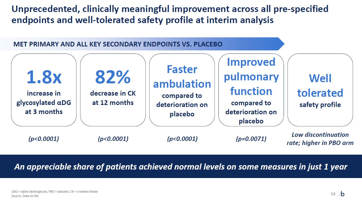 Unprecedented, clinically meaningful improvement across all pre-specified endpoints and well-tolerated safety profile at interim analysis  MET PRIMARY AND ALL KEY SECONDARY ENDPOINTS VS. PLACEBO  14  1.8x  increase in glycosylated αDG at 3 months  82%  decrease in CK at 12 months  Faster ambulation  compared to deterioration on placebo  Improved pulmonary function  compared to deterioration on placebo  (p<0.0001)  An appreciable share of patients achieved normal levels on some measures in just 1 year  Well tolerated  safety profile  (p<0.0001)  (p<0.0001)  (p=0.0071)  Low discontinuation rate; higher in PBO arm  αDG = alpha dystroglycan; PBO = placebo; CK = creatine kinase Source: Data on file