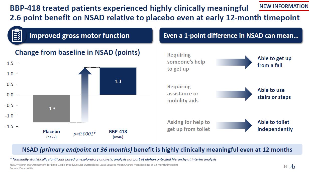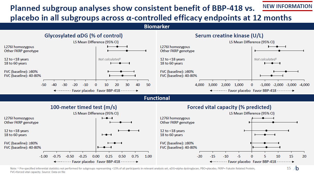 -20  -15  10  15  20  L276I homozygous Other FKRP genotype  12 to <18 years  18 to 60 years  FVC (baseline): ≥80%  FVC (baseline): 40-80%  -1.00  -0.75  -0.50 -0.25 0.00 0.25 0.50 0.75 1.00  L276I homozygous Other FKRP genotype  12 to <18 years  18 to 60 years  FVC (baseline): ≥80%  FVC (baseline): 40-80%  Planned subgroup analyses show consistent benefit of BBP-418 vs.  placebo in all subgroups across α-controlled efficacy endpoints at 12 months  15  Biomarker  Forced vital capacity (% predicted)  LS Mean Difference (95% CI)  100-meter timed test (m/s)  LS Mean Difference (95% CI)  Functional  Note: 1 Pre-specified inferential statistics not performed for subgroups representing <15% of all participants in relevant analysis set; αDG=alpha dystroglycan; PBO=placebo; FKRP= Fukutin Related Protein; FVC=forced vital capacity. Source: Data on file  Glycosylated αDG (% of control)  LS Mean Difference (95% CI)  L276I homozygous Other FKRP genotype  12 to <18 years Not calculated1  18 to 60 years  FVC (baseline): ≥80%  FVC (baseline): 40-80%  -50 -40 -30 -20 -10 0 10 20 30 40 50  Favor placebo Favor BBP-418  Serum creatine kinase (U/L)  LS Mean Difference (95% CI)  L276I homozygous Other FKRP genotype  12 to <18 years Not calculated1  18 to 60 years  FVC (baseline): ≥80%  FVC (baseline): 40-80%  4,000 3,000 2,000 1,000 0 -1,000 -2,000 -3,000 -4,000  Favor placebo Favor BBP-418  -10 -5 0 5  Favor placebo Favor BBP-418  Favor placebo Favor BBP-418  NEW INFORMATION