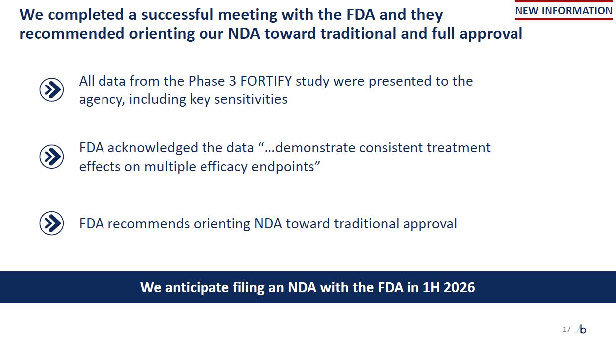 We completed a successful meeting with the FDA and they  17  We anticipate filing an NDA with the FDA in 1H 2026  recommended orienting our NDA toward traditional and full approval  All data from the Phase 3 FORTIFY study were presented to the agency, including key sensitivities  FDA acknowledged the data “…demonstrate consistent treatment effects on multiple efficacy endpoints”  FDA recommends orienting NDA toward traditional approval  NEW INFORMATION
