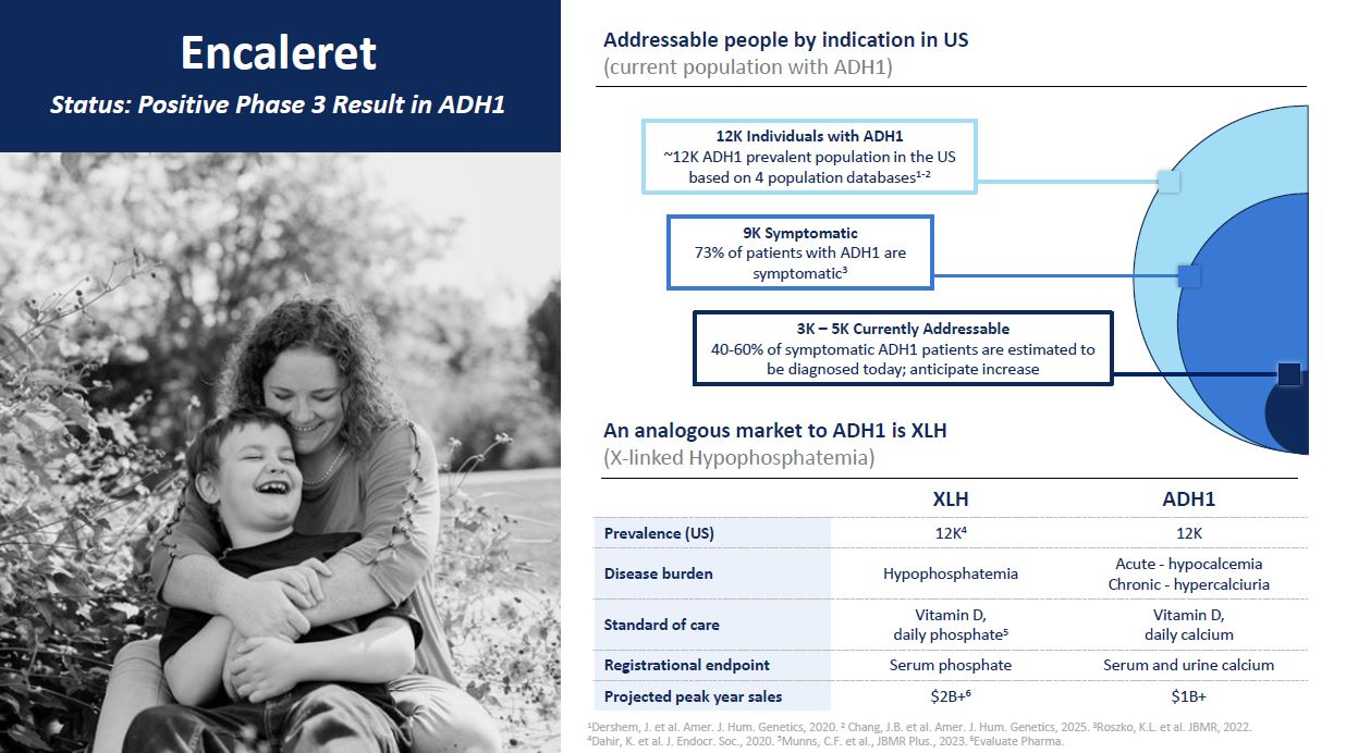 Encaleret  Status: Positive Phase 3 Result in ADH1  Addressable people by indication in US  (current population with ADH1)  An analogous market to ADH1 is XLH  (X-linked Hypophosphatemia)  XLH  ADH1  Prevalence (US)  12K4  12K  Disease burden  Hypophosphatemia  Acute - hypocalcemia Chronic - hypercalciuria  Standard of care  Vitamin D, daily phosphate5  Vitamin D, daily calcium  Registrational endpoint  Serum phosphate  Serum and urine calcium  Projected peak year sales  $2B+6  $1B+  1Dershem, J. et al. Amer. J. Hum. Genetics, 2020. 2 Chang, J.B. et al. Amer. J. Hum. Genetics, 2025. 3Roszko, K.L. et al. JBMR, 2022.  4Dahir, K. et al. J. Endocr. Soc., 2020. 5Munns, C.F. et al., JBMR Plus., 2023. 6Evaluate Pharma.  12K Individuals with ADH1  ~12K ADH1 prevalent population in the US based on 4 population databases1-2  9K Symptomatic  73% of patients with ADH1 are  symptomatic3  3K – 5K Currently Addressable  40-60% of symptomatic ADH1 patients are estimated to  be diagnosed today; anticipate increase