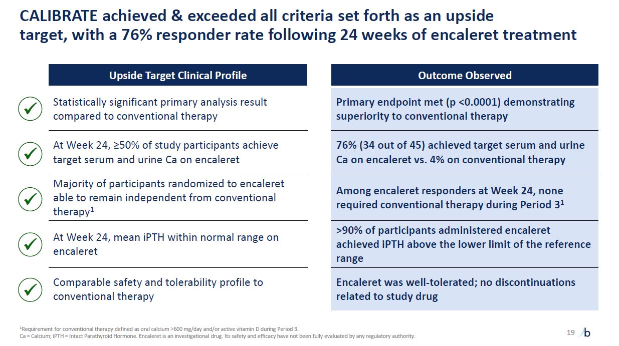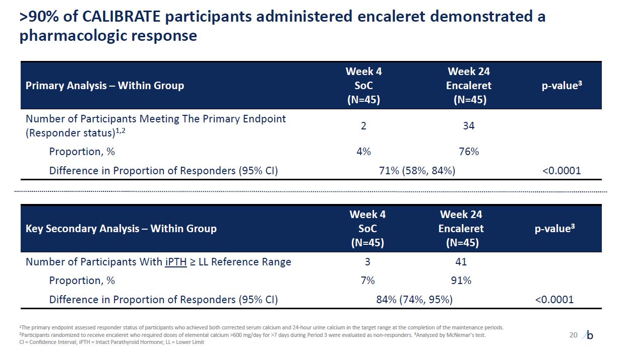 CALIBRATE achieved & exceeded all criteria set forth as an upside  target, with a 76% responder rate following 24 weeks of encaleret treatment  Upside Target Clinical Profile  Outcome Observed  Statistically significant primary analysis result compared to conventional therapy  Primary endpoint met (p <0.0001) demonstrating superiority to conventional therapy  At Week 24, ≥50% of study participants achieve  target serum and urine Ca on encaleret  76% (34 out of 45) achieved target serum and urine Ca on encaleret vs. 4% on conventional therapy  Majority of participants randomized to encaleret able to remain independent from conventional therapy1  Among encaleret responders at Week 24, none required conventional therapy during Period 31  At Week 24, mean iPTH within normal range on encaleret  >90% of participants administered encaleret achieved iPTH above the lower limit of the reference range  Comparable safety and tolerability profile to conventional therapy  Encaleret was well-tolerated; no discontinuations related to study drug            19  1Requirement for conventional therapy defined as oral calcium >600 mg/day and/or active vitamin D during Period 3.  Ca = Calcium; iPTH = Intact Parathyroid Hormone. Encaleret is an investigational drug. Its safety and efficacy have not been fully evaluated by any regulatory authority.
