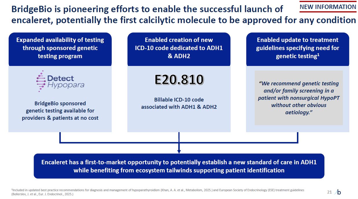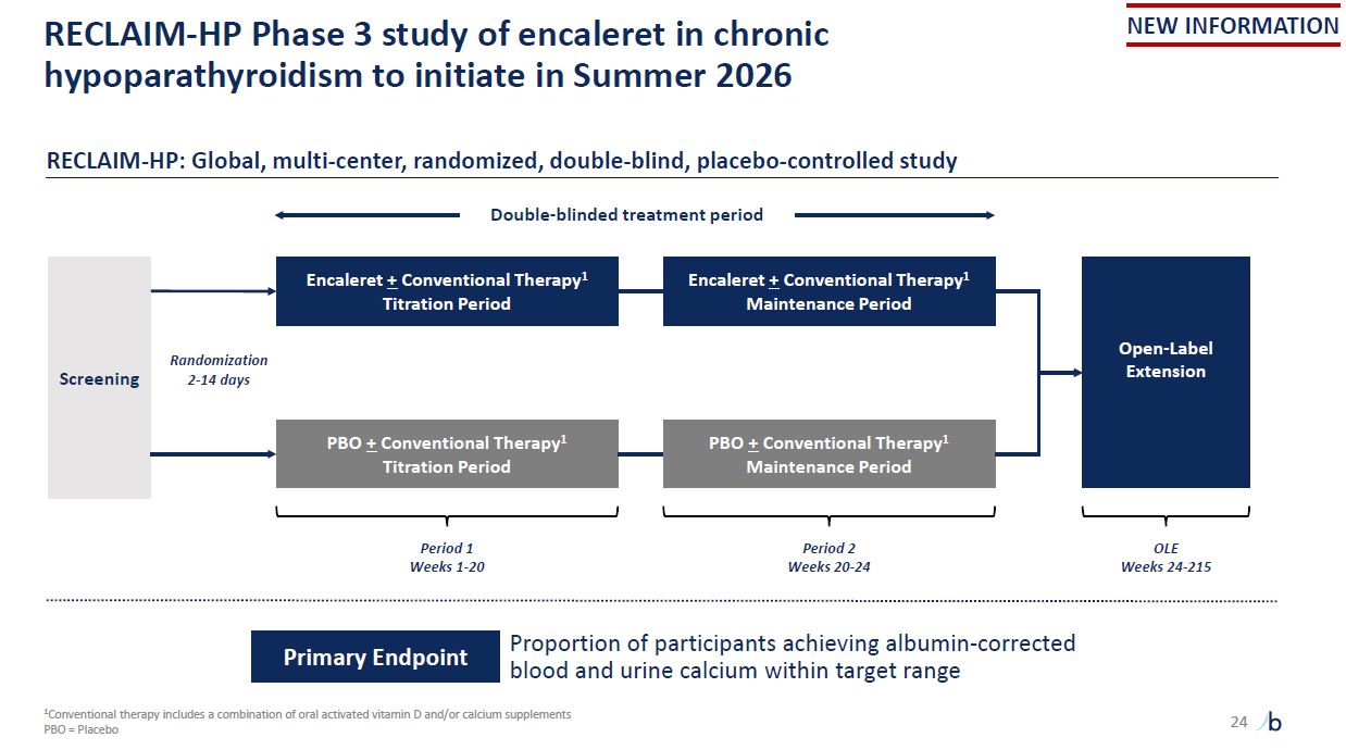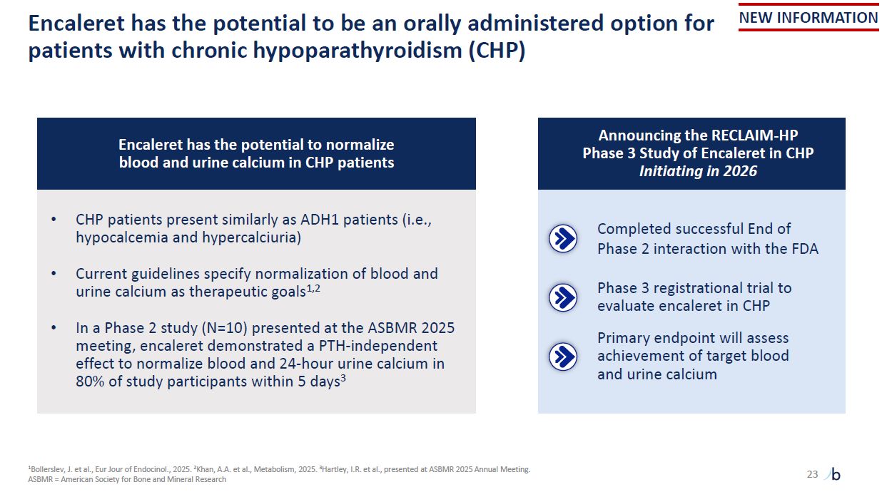 Encaleret has the potential to be an orally administered option for patients with chronic hypoparathyroidism (CHP)  1Bollerslev, J. et al., Eur Jour of Endocinol., 2025. 2Khan, A.A. et al., Metabolism, 2025. 3Hartley, I.R. et al., presented at ASBMR 2025 Annual Meeting. ASBMR = American Society for Bone and Mineral Research  NEW INFORMATION  23  Encaleret has the potential to normalize blood and urine calcium in CHP patients  CHP patients present similarly as ADH1 patients (i.e., hypocalcemia and hypercalciuria)  Current guidelines specify normalization of blood and urine calcium as therapeutic goals1,2  In a Phase 2 study (N=10) presented at the ASBMR 2025 meeting, encaleret demonstrated a PTH-independent effect to normalize blood and 24-hour urine calcium in 80% of study participants within 5 days3  Announcing the RECLAIM-HP Phase 3 Study of Encaleret in CHP Initiating in 2026  Completed successful End of Phase 2 interaction with the FDA  Phase 3 registrational trial to evaluate encaleret in CHP  Primary endpoint will assess achievement of target blood and urine calcium