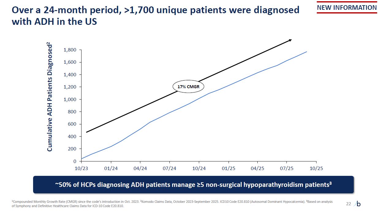 Over a 24-month period, >1,700 unique patients were diagnosed with ADH in the US  1Compounded Monthly Growth Rate (CMGR) since the code’s introduction in Oct. 2023. 2Komodo Claims Data, October 2023-September 2025. ICD10 Code E20.810 (Autosomal Dominant Hypocalcemia). 3Based on analysis of Symphony and Definitive Healthcare Claims Data for ICD-10 Code E20.810.  Cumulative ADH Patients Diagnosed2  1,000  800  600  400  200  0  10/23 01/24 04/24 07/24 10/24 01/25 04/25 07/25 10/25  ~50% of HCPs diagnosing ADH patients manage ≥5 non-surgical hypoparathyroidism patients3  1,200  1,800  1,600  1,400  17% CMGR  NEW INFORMATION  22