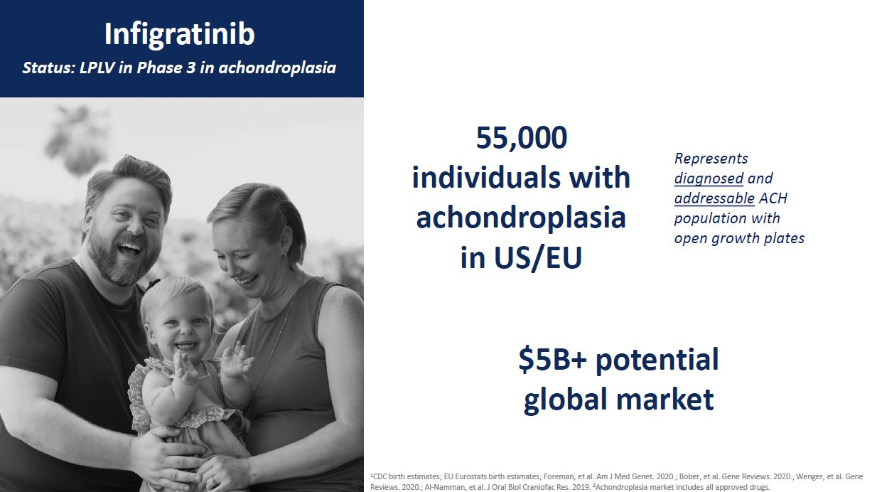 Infigratinib  Status: LPLV in Phase 3 in achondroplasia  1CDC birth estimates; EU Eurostats birth estimates; Foreman, et al. Am J Med Genet. 2020.; Bober, et al. Gene Reviews. 2020.; Wenger, et al. Gene Reviews. 2020.; Al-Namman, et al. J Oral Biol Craniofac Res. 2019. 2Achondroplasia market includes all approved drugs.  Represents diagnosed and addressable ACH population with open growth plates  55,000  individuals with achondroplasia in US/EU  $5B+ potential global market