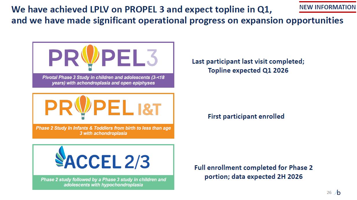 Last participant last visit completed; Topline expected Q1 2026  Pivotal Phase 3 Study in children and adolescents (3-<18 years) with achondroplasia and open epiphyses  Phase 2 Study In Infants & Toddlers from birth to less than age 3 with achondroplasia  Full enrollment completed for Phase 2 portion; data expected 2H 2026  2/3  Phase 2 study followed by a Phase 3 study in children and adolescents with hypochondroplasia  First participant enrolled  NEW INFORMATION  We have achieved LPLV on PROPEL 3 and expect topline in Q1,  and we have made significant operational progress on expansion opportunities  26