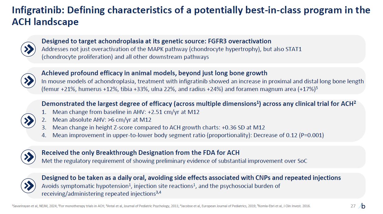 Designed to target achondroplasia at its genetic source: FGFR3 overactivation  Addresses not just overactivation of the MAPK pathway (chondrocyte hypertrophy), but also STAT1 (chondrocyte proliferation) and all other downstream pathways  Achieved profound efficacy in animal models, beyond just long bone growth  In mouse models of achondroplasia, treatment with infigratinib showed an increase in proximal and distal long bone length  (femur +21%, humerus +12%, tibia +33%, ulna 22%, and radius +24%) and foramen magnum area (+17%)5  Demonstrated the largest degree of efficacy (across multiple dimensions1) across any clinical trial for ACH2  Mean change from baseline in AHV: +2.51 cm/yr at M12  Mean absolute AHV: >6 cm/yr at M12  Mean change in height Z-score compared to ACH growth charts: +0.36 SD at M12  Mean improvement in upper-to-lower body segment ratio (proportionality): Decrease of 0.12 (P=0.001)  Received the only Breakthrough Designation from the FDA for ACH  Met the regulatory requirement of showing preliminary evidence of substantial improvement over SoC  Designed to be taken as a daily oral, avoiding side effects associated with CNPs and repeated injections Avoids symptomatic hypotension1, injection site reactions1, and the psychosocial burden of receiving/administering repeated injections3,4  27  Infigratinib: Defining characteristics of a potentially best-in-class program in the ACH landscape  1Savarirayan et al, NEJM, 2024; 2For monotherapy trials in ACH; 3Antal et al, Journal of Pediatric Psychology, 2011; 4Jacobse et al, European Journal of Pediatrics, 2019; 5Komla-Ebri et al, J Clin Invest. 2016.