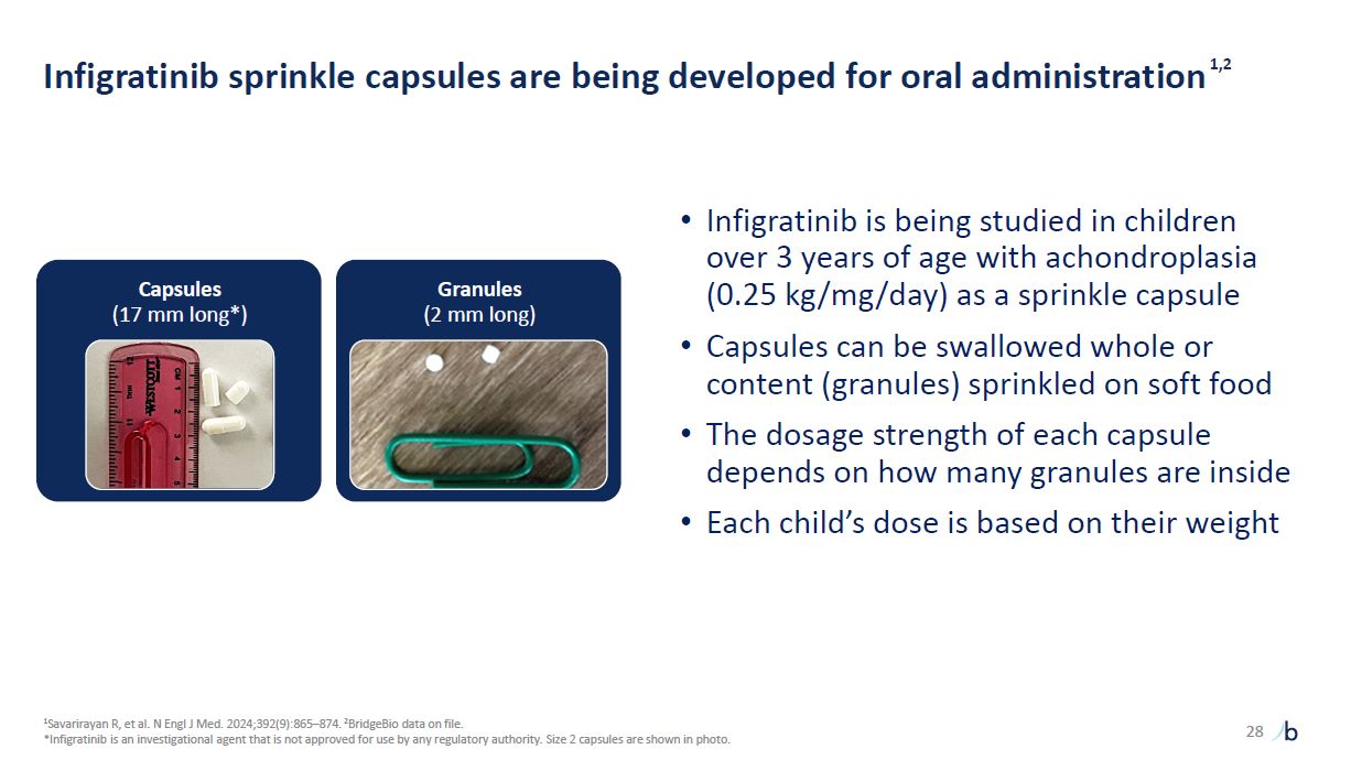 Infigratinib sprinkle capsules are being developed for oral administration1,2  28  1Savarirayan R, et al. N Engl J Med. 2024;392(9):865–874. 2BridgeBio data on file.  *Infigratinib is an investigational agent that is not approved for use by any regulatory authority. Size 2 capsules are shown in photo.  Infigratinib is being studied in children over 3 years of age with achondroplasia (0.25 kg/mg/day) as a sprinkle capsule  Capsules can be swallowed whole or content (granules) sprinkled on soft food  The dosage strength of each capsule depends on how many granules are inside  Each child’s dose is based on their weight  Capsules  (17 mm long*)  Granules  (2 mm long)