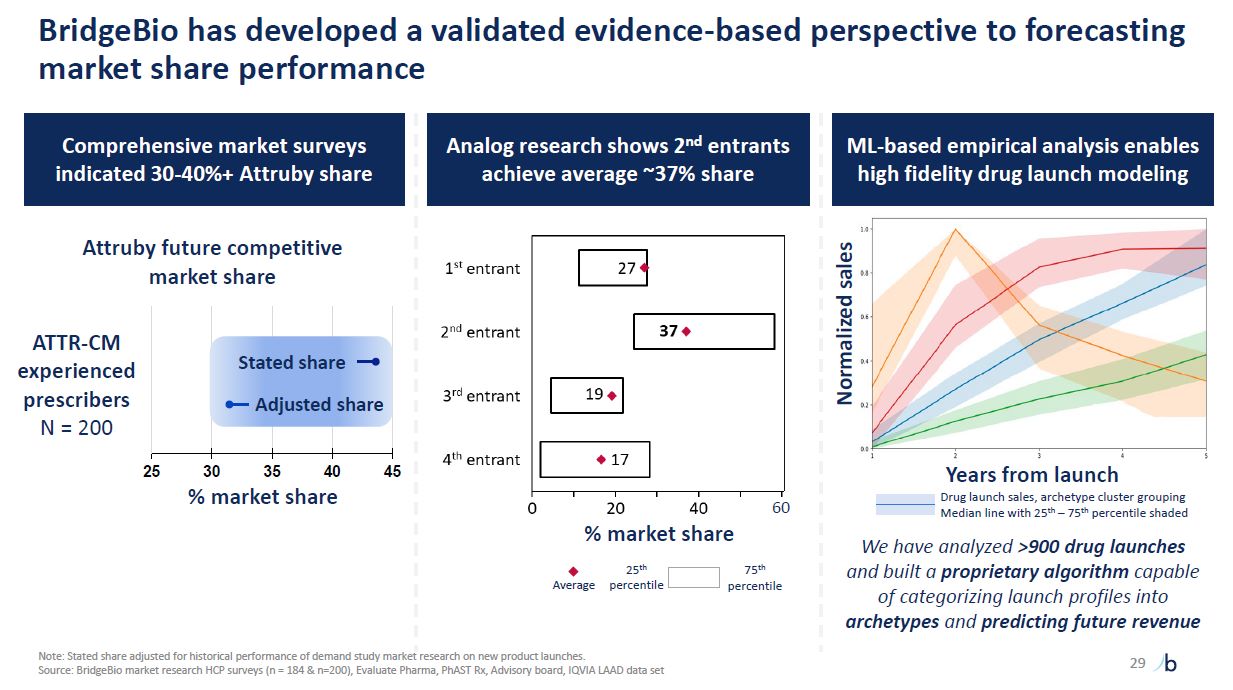 BridgeBio has developed a validated evidence-based perspective to forecasting market share performance  29  Comprehensive market surveys indicated 30-40%+ Attruby share  Attruby future competitive market share  25  30 35 40  % market share  45  ATTR-CM  experienced prescribers N = 200  Stated share  Adjusted share  60  Analog research shows 2nd entrants achieve average ~37% share  Average  25th percentile  75th percentile  ML-based empirical analysis enables high fidelity drug launch modeling  % market share  Normalized sales  Years from launch  Drug launch sales, archetype cluster grouping Median line with 25th – 75th percentile shaded  We have analyzed >900 drug launches and built a proprietary algorithm capable of categorizing launch profiles into archetypes and predicting future revenue     Note: Stated share adjusted for historical performance of demand study market research on new product launches.  Source: BridgeBio market research HCP surveys (n = 184 & n=200), Evaluate Pharma, PhAST Rx, Advisory board, IQVIA LAAD data set