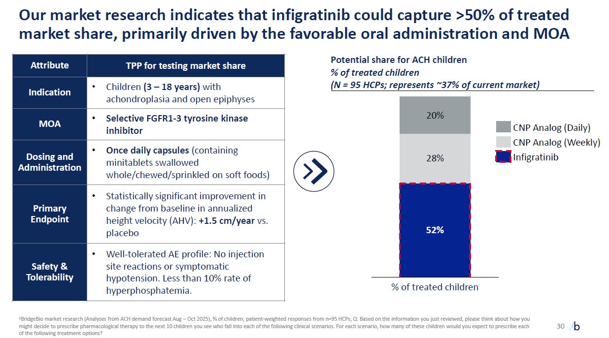 Our market research indicates that infigratinib could capture >50% of treated market share, primarily driven by the favorable oral administration and MOA  30  Attribute  TPP for testing market share  Indication  Children (3 – 18 years) with achondroplasia and open epiphyses  MOA  Selective FGFR1-3 tyrosine kinase inhibitor  Dosing and Administration  Once daily capsules (containing minitablets swallowed whole/chewed/sprinkled on soft foods)  Primary Endpoint  Statistically significant improvement in change from baseline in annualized height velocity (AHV): +1.5 cm/year vs. placebo  Safety & Tolerability  Well-tolerated AE profile: No injection site reactions or symptomatic hypotension. Less than 10% rate of hyperphosphatemia.  Potential share for ACH children  % of treated children  (N = 95 HCPs; represents ~37% of current market)   52%  28%  20%  % of treated children  CNP Analog (Daily) CNP Analog (Weekly) Infigratinib  1BridgeBio market research (Analyses from ACH demand forecast Aug – Oct 2025); % of children; patient-weighted responses from n=95 HCPs; Q: Based on the information you just reviewed, please think about how you might decide to prescribe pharmacological therapy to the next 10 children you see who fall into each of the following clinical scenarios. For each scenario, how many of these children would you expect to prescribe each of the following treatment options?