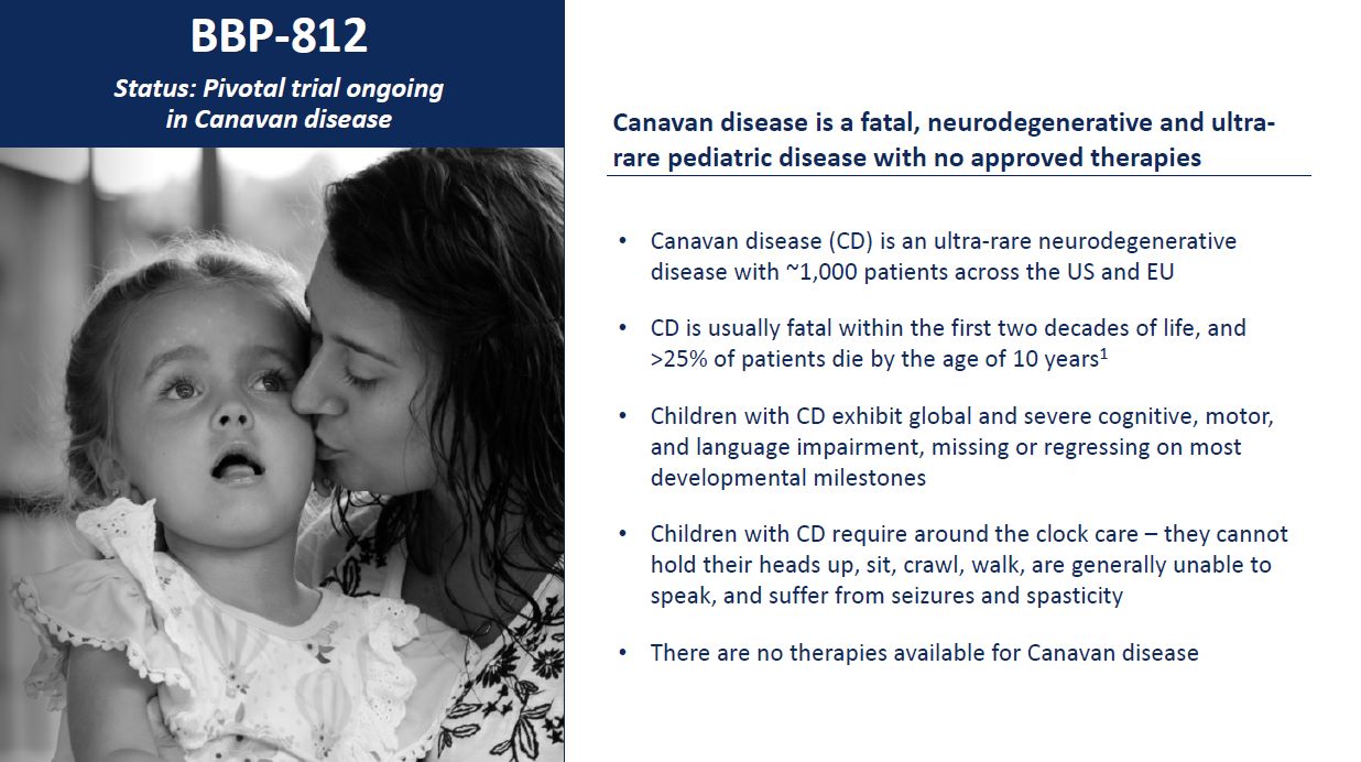 BBP-812  Status: Pivotal trial ongoing in Canavan disease  Canavan disease (CD) is an ultra-rare neurodegenerative disease with ~1,000 patients across the US and EU  CD is usually fatal within the first two decades of life, and  >25% of patients die by the age of 10 years1  Children with CD exhibit global and severe cognitive, motor, and language impairment, missing or regressing on most developmental milestones  Children with CD require around the clock care – they cannot hold their heads up, sit, crawl, walk, are generally unable to speak, and suffer from seizures and spasticity  There are no therapies available for Canavan disease  Canavan disease is a fatal, neurodegenerative and ultra-rare pediatric disease with no approved therapies