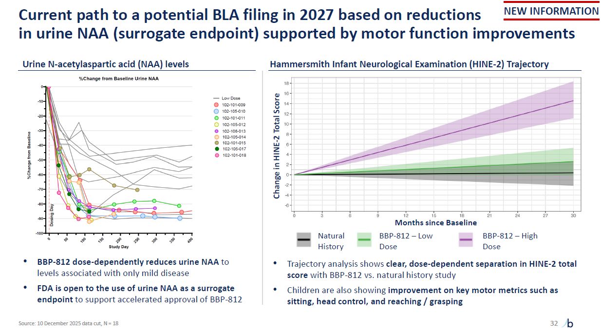 Current path to a potential BLA filing in 2027 based on reductions  in urine NAA (surrogate endpoint) supported by motor function improvements  32  Urine N-acetylaspartic acid (NAA) levels Hammersmith Infant Neurological Examination (HINE-2) Trajectory  BBP-812 dose-dependently reduces urine NAA to levels associated with only mild disease  FDA is open to the use of urine NAA as a surrogate endpoint to support accelerated approval of BBP-812  Trajectory analysis shows clear, dose-dependent separation in HINE-2 total score with BBP-812 vs. natural history study  Children are also showing improvement on key motor metrics such as sitting, head control, and reaching / grasping  Change in HINE-2 Total Score  Natural History  BBP-812 – Low  Dose  BBP-812 – High  Dose  Months since Baseline  NEW INFORMATION  Source: 10 December 2025 data cut, N = 18