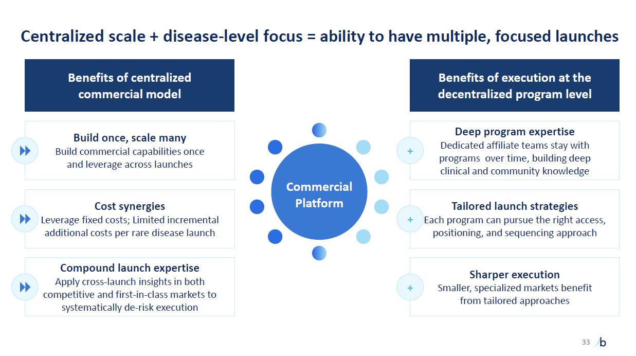 Centralized scale + disease-level focus = ability to have multiple, focused launches  33  Deep program expertise Dedicated affiliate teams stay with programs over time, building deep clinical and community knowledge  Tailored launch strategies  Each program can pursue the right access, positioning, and sequencing approach  Sharper execution  Smaller, specialized markets benefit from tailored approaches  Benefits of execution at the decentralized program level  Benefits of centralized commercial model  Build once, scale many  Build commercial capabilities once and leverage across launches  Cost synergies  Leverage fixed costs; Limited incremental additional costs per rare disease launch  Compound launch expertise  Apply cross-launch insights in both competitive and first-in-class markets to systematically de-risk execution  +  +  +  Commercial Platform