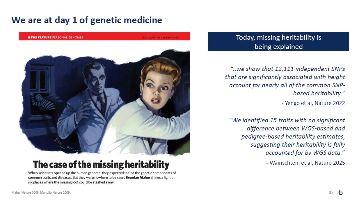 We are at day 1 of genetic medicine  35  Maher Nature 2008; Manolio Nature 2009.  “..we show that 12,111 independent SNPs that are significantly associated with height account for nearly all of the common SNP-  based heritability.”  - Yengo et al, Nature 2022  “We identified 15 traits with no significant difference between WGS-based and pedigree-based heritability estimates, suggesting their heritability is fully accounted for by WGS data.”  - Wainschtein et al, Nature 2025  Today, missing heritability is being explained