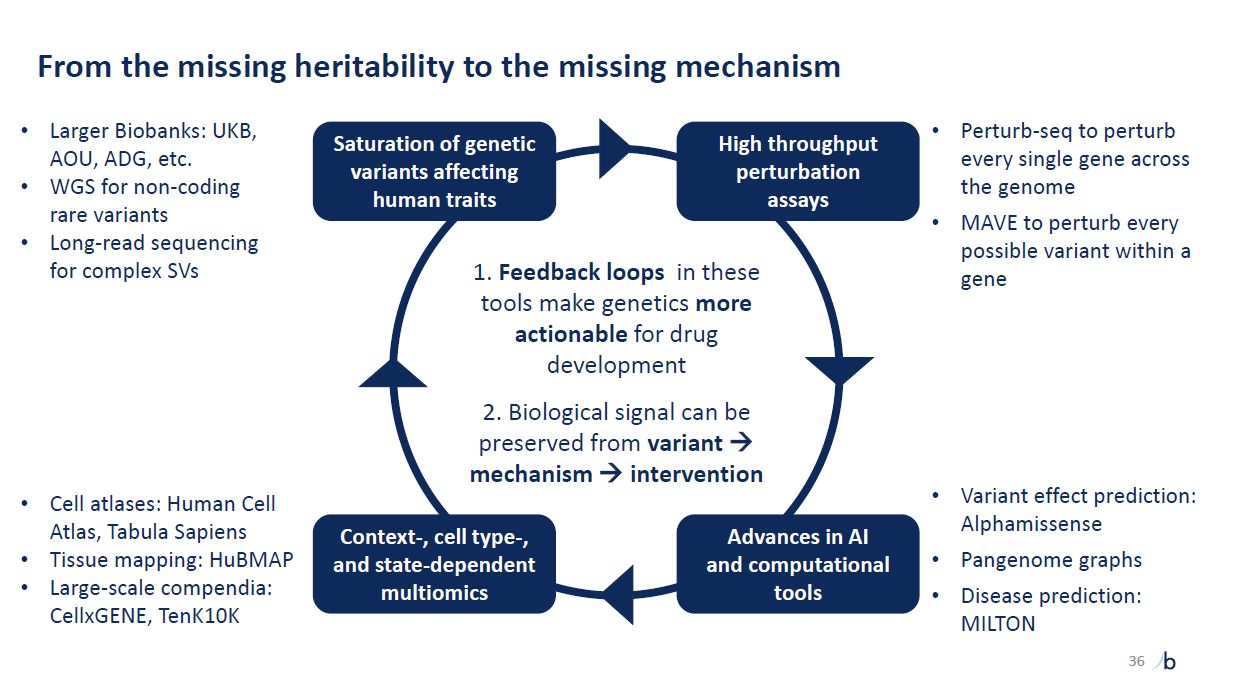 From the missing heritability to the missing mechanism  Variant effect prediction: Alphamissense  Pangenome graphs  Disease prediction: MILTON  36   Feedback loops in these tools make genetics more  actionable for drug development  Biological signal can be preserved from variant  mechanism  intervention  High throughput perturbation assays  Advances in AI and computational  tools  Context-, cell type-, and state-dependent multiomics  Saturation of genetic variants affecting human traits  Larger Biobanks: UKB, AOU, ADG, etc.  WGS for non-coding rare variants  Long-read sequencing for complex SVs  Cell atlases: Human Cell Atlas, Tabula Sapiens  Tissue mapping: HuBMAP  Large-scale compendia: CellxGENE, TenK10K  Perturb-seq to perturb every single gene across the genome  MAVE to perturb every possible variant within a gene