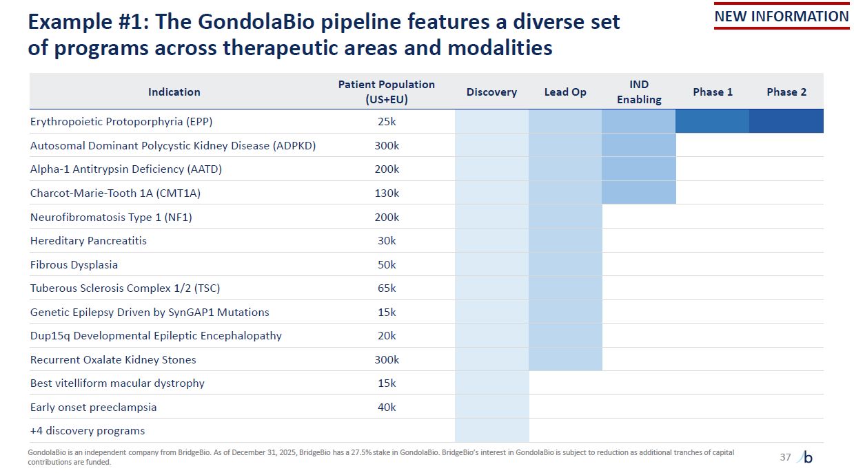 Example #1: The GondolaBio pipeline features a diverse set of programs across therapeutic areas and modalities  37  GondolaBio is an independent company from BridgeBio. As of December 31, 2025, BridgeBio has a 27.5% stake in GondolaBio. BridgeBio’s interest in GondolaBio is subject to reduction as additional tranches of capital contributions are funded.  NEW INFORMATION  Indication  Patient Population (US+EU)  Discovery  Lead Op  IND  Enabling  Phase 1  Phase 2  Erythropoietic Protoporphyria (EPP)  25k  Autosomal Dominant Polycystic Kidney Disease (ADPKD)  300k  Alpha-1 Antitrypsin Deficiency (AATD)  200k  Charcot-Marie-Tooth 1A (CMT1A)  130k  Neurofibromatosis Type 1 (NF1)  200k  Hereditary Pancreatitis  30k  Fibrous Dysplasia  50k  Tuberous Sclerosis Complex 1/2 (TSC)  65k  Genetic Epilepsy Driven by SynGAP1 Mutations  15k  Dup15q Developmental Epileptic Encephalopathy  20k  Recurrent Oxalate Kidney Stones  300k  Best vitelliform macular dystrophy  15k  Early onset preeclampsia  40k  +4 discovery programs