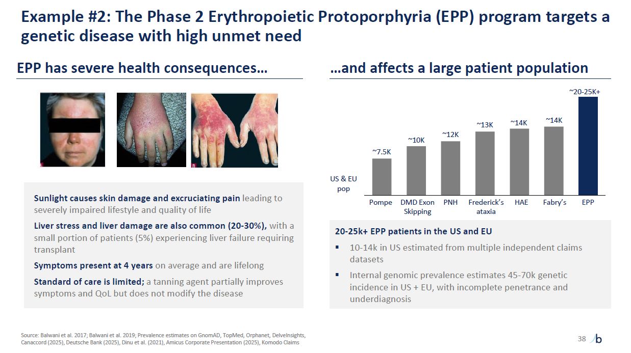 Example #2: The Phase 2 Erythropoietic Protoporphyria (EPP) program targets a genetic disease with high unmet need  Sunlight causes skin damage and excruciating pain leading to severely impaired lifestyle and quality of life  Liver stress and liver damage are also common (20-30%), with a small portion of patients (5%) experiencing liver failure requiring transplant  Symptoms present at 4 years on average and are lifelong  Standard of care is limited; a tanning agent partially improves symptoms and QoL but does not modify the disease  EPP has severe health consequences… …and affects a large patient population  20-25k+ EPP patients in the US and EU  10-14k in US estimated from multiple independent claims datasets  Internal genomic prevalence estimates 45-70k genetic incidence in US + EU, with incomplete penetrance and underdiagnosis  Pompe DMD Exon PNH  Skipping  Frederick’s HAE Fabry’s EPP ataxia  US & EU  pop  ~7.5K  ~10K  ~12K  ~13K  ~14K  ~20-25K+  ~14K  Source: Balwani et al. 2017; Balwani et al. 2019; Prevalence estimates on GnomAD, TopMed, Orphanet, DelveInsights, Canaccord (2025), Deutsche Bank (2025), Dinu et al. (2021), Amicus Corporate Presentation (2025), Komodo Claims  38