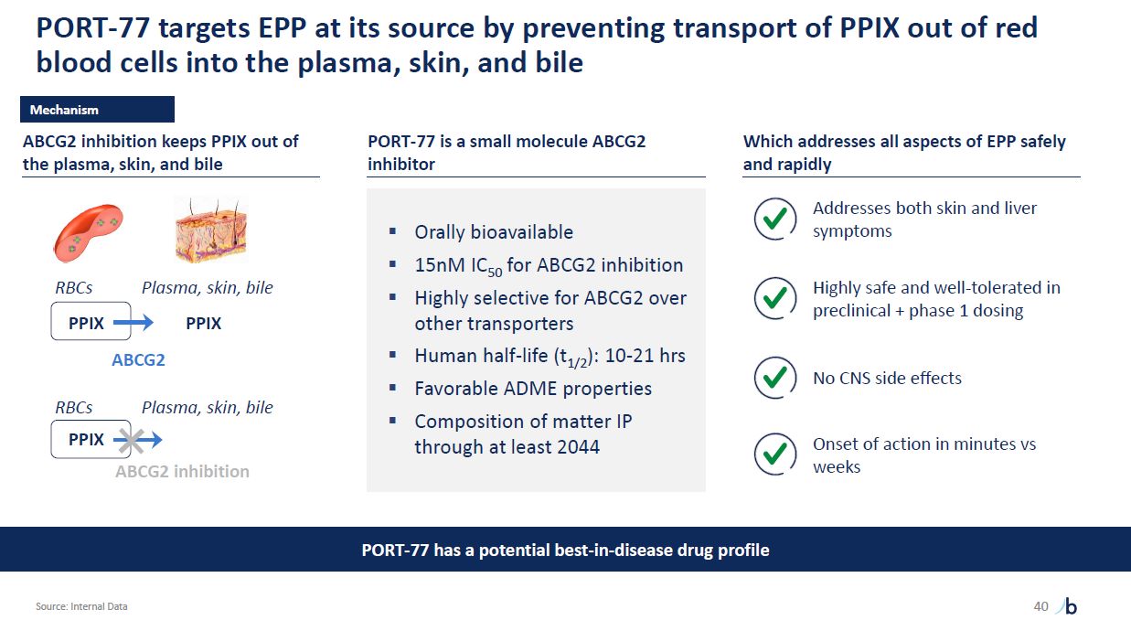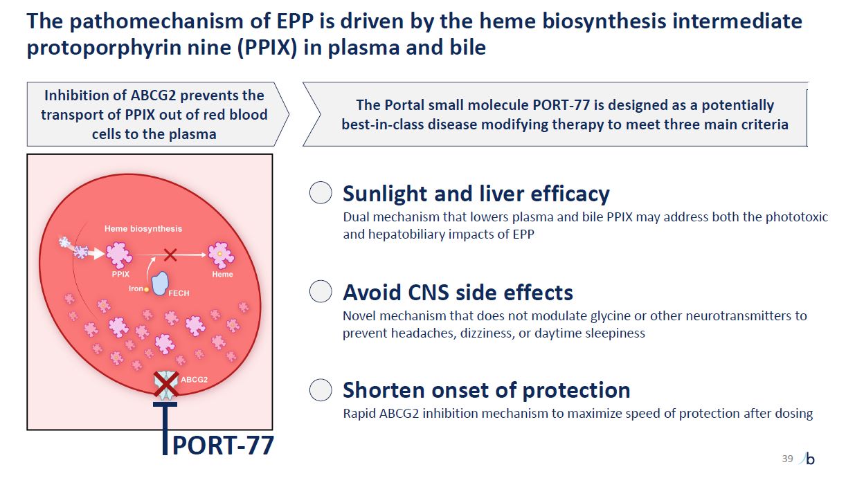 The pathomechanism of EPP is driven by the heme biosynthesis intermediate protoporphyrin nine (PPIX) in plasma and bile  Inhibition of ABCG2 prevents the transport of PPIX out of red blood cells to the plasma  Sunlight and liver efficacy  Dual mechanism that lowers plasma and bile PPIX may address both the phototoxic and hepatobiliary impacts of EPP  Avoid CNS side effects  Novel mechanism that does not modulate glycine or other neurotransmitters to prevent headaches, dizziness, or daytime sleepiness  Shorten onset of protection  Rapid ABCG2 inhibition mechanism to maximize speed of protection after dosing  PORT-77  The Portal small molecule PORT-77 is designed as a potentially best-in-class disease modifying therapy to meet three main criteria  39