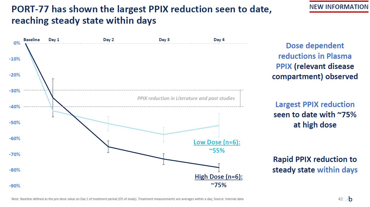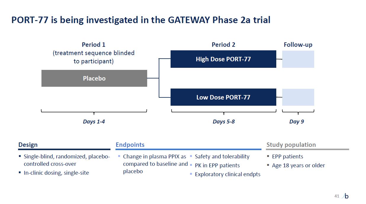 PORT-77 is being investigated in the GATEWAY Phase 2a trial  Placebo  High Dose PORT-77  Period 1  (treatment sequence blinded to participant)  Period 2  Follow-up  Low Dose PORT-77  placebo  Exploratory clinical endpts  Endpoints  Change in plasma PPIX as  Safety and tolerability compared to baseline and  PK in EPP patients  Single-blind, randomized, placebo-controlled cross-over  In-clinic dosing, single-site  Design  Study population  EPP patients  Age 18 years or older  Days 1-4  Days 5-8  Day 9  41