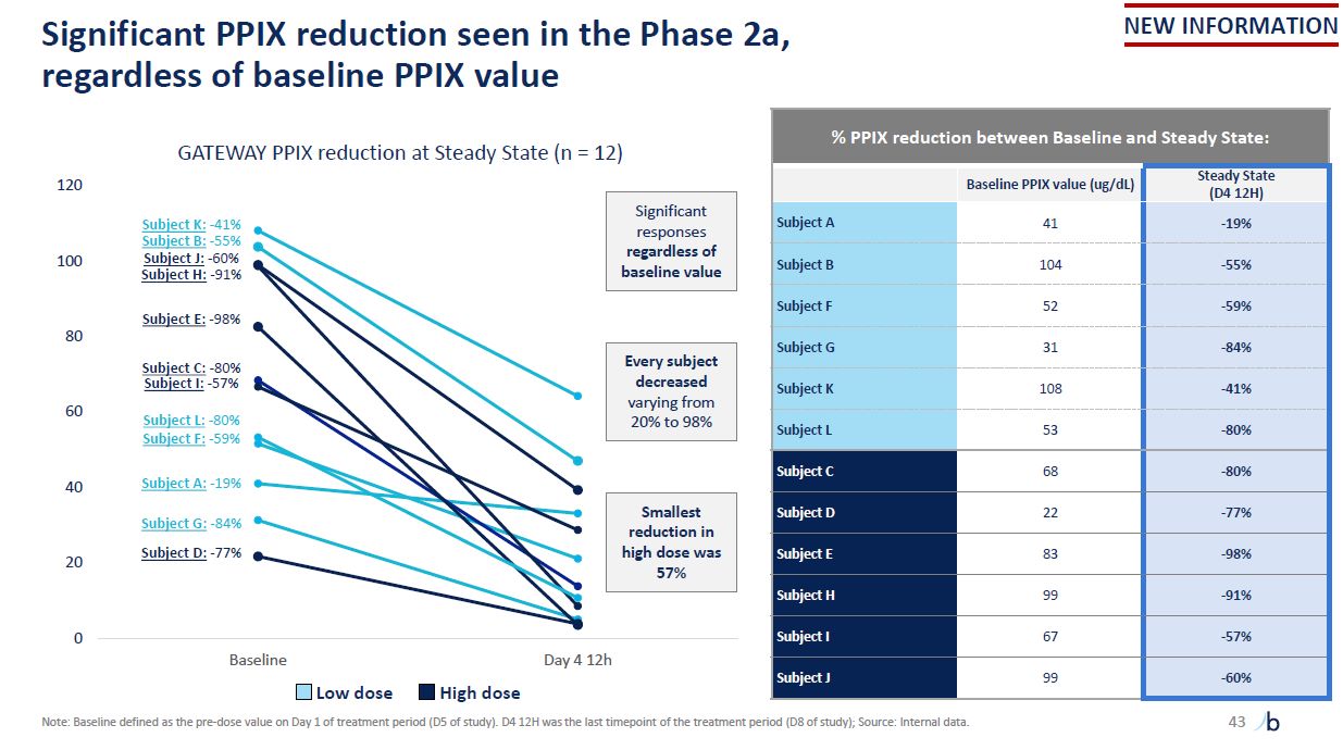 Significant PPIX reduction seen in the Phase 2a, regardless of baseline PPIX value  0  20  40  60  Subject E: -98%  80  100  GATEWAY PPIX reduction at Steady State (n = 12)  120  Baseline  Day 4 12h  Subject K: -41%  Subject B: -55%  Subject J: -60%  Subject H: -91%  Subject A: -19%  Subject C: -80%  Subject I: -57%  Subject D: -77%  Subject G: -84%  Subject L: -80%  Subject F: -59%  % PPIX reduction between Baseline and Steady State:  Baseline PPIX value (ug/dL)  Steady State (D4 12H)  Subject A  41  -19%  Subject B  104  -55%  Subject F  52  -59%  Subject G  31  -84%  Subject K  108  -41%  Subject L  53  -80%  Subject C  68  -80%  Subject D  22  -77%  Subject E  83  -98%  Subject H  99  -91%  Subject I  67  -57%  Subject J  99  -60%  Low dose High dose  Note: Baseline defined as the pre-dose value on Day 1 of treatment period (D5 of study). D4 12H was the last timepoint of the treatment period (D8 of study); Source: Internal data.  Significant responses regardless of baseline value  Every subject decreased varying from 20% to 98%  Smallest reduction in high dose was 57%  NEW INFORMATION  43