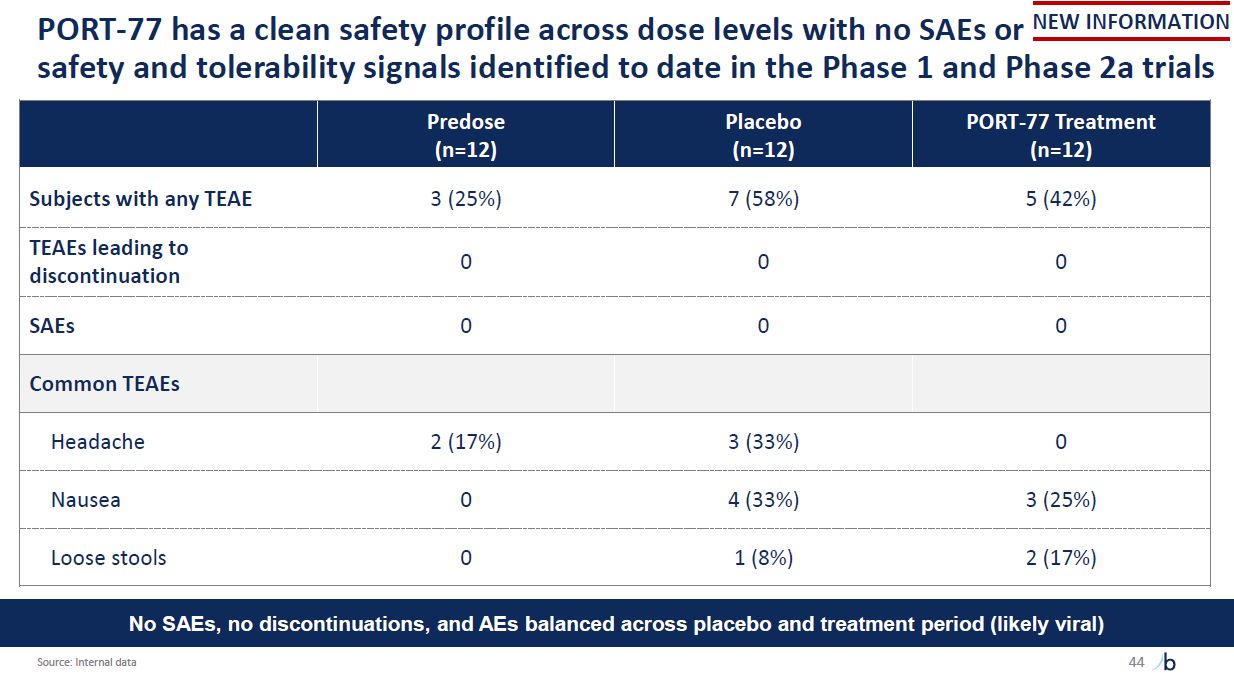 safety and tolerability signals identified to date in the Phase 1 and Phase 2a trials  PORT-77 has a clean safety profile across dose levels with no SAEs or NEW INFORMATION  Predose (n=12)  Placebo (n=12)  PORT-77 Treatment (n=12)  Subjects with any TEAE  3 (25%)  7 (58%)  5 (42%)  TEAEs leading to discontinuation  0  0  0  SAEs  0  0  0  Common TEAEs  Headache  2 (17%)  3 (33%)  0  Nausea  0  4 (33%)  3 (25%)  Loose stools  0  1 (8%)  2 (17%)  No SAEs, no discontinuations, and AEs balanced across placebo and treatment period (likely viral)  Source: Internal data  44