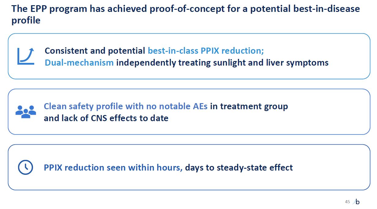 The EPP program has achieved proof-of-concept for a potential best-in-disease profile  Consistent and potential best-in-class PPIX reduction;  Dual-mechanism independently treating sunlight and liver symptoms  Clean safety profile with no notable AEs in treatment group and lack of CNS effects to date  PPIX reduction seen within hours, days to steady-state effect  45