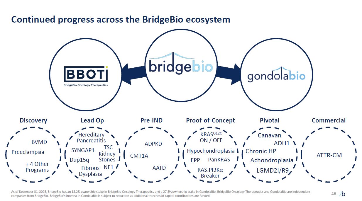 Continued progress across the BridgeBio ecosystem  46  + 4 Other Programs  BVMD  Preeclampsia  Fibrous Dysplasia  SYNGAP1  Dup15q  Kidney Stones  ADPKD  AATD  CMT1A  RAS:PI3Kα  Breaker  PanKRAS  KRASG12C ON / OFF  HHypypoochchoonndropElPaPsia  Canavan  ADH1  Chronic HP  Achondroplasia  LGMD2I/R9  ATTR-CM  Pivotal  Discovery  Lead Op  Pre-IND  Proof-of-Concept  Commercial  As of December 31, 2025, BridgeBio has an 18.2% ownership stake in BridgeBio Oncology Therapeutics and a 27.5% ownership stake in GondolaBio. BridgeBio Oncology Therapeutics and GondolaBio are independent companies from BridgeBio. BridgeBio’s interest in GondolaBio is subject to reduction as additional tranches of capital contributions are funded.  EPP  NF1  Hereditary Pancreatitis  TSC