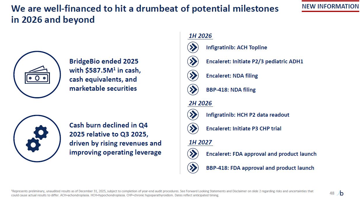 Cash burn declined in Q4 2025 relative to Q3 2025, driven by rising revenues and improving operating leverage  BridgeBio ended 2025 with $587.5M1 in cash, cash equivalents, and marketable securities  We are well-financed to hit a drumbeat of potential milestones in 2026 and beyond  1Represents preliminary, unaudited results as of December 31, 2025, subject to completion of year-end audit procedures. See Forward Looking Statements and Disclaimer on slide 2 regarding risks and uncertainties that could cause actual results to differ. ACH=achondroplasia. HCH=hypochondroplasia. CHP=chronic hypoparathyroidism. Dates reflect anticipated timing.  48   1H 2026  Infigratinib: ACH Topline  Encaleret: Initiate P2/3 pediatric ADH1  Encaleret: NDA filing  BBP-418: NDA filing  Encaleret: Initiate P3 CHP trial   2H 2026  Infigratinib: HCH P2 data readout  BBP-418: FDA approval and product launch   1H 2027  Encaleret: FDA approval and product launch  NEW INFORMATION