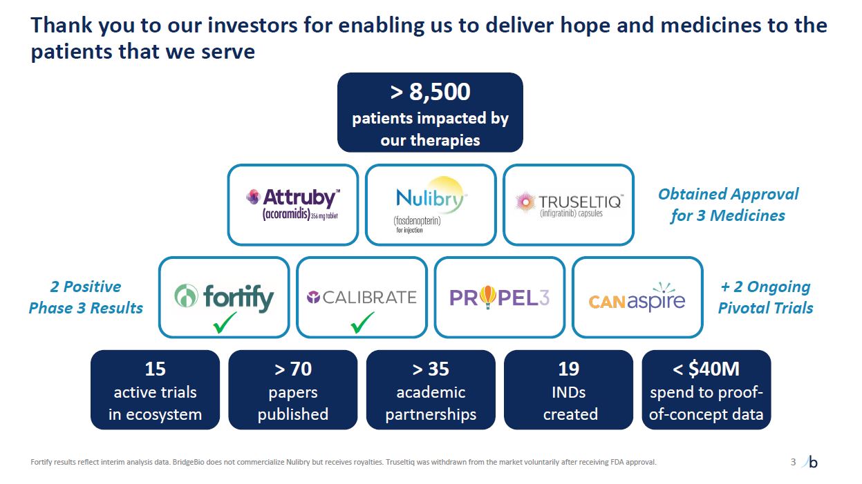 Thank you to our investors for enabling us to deliver hope and medicines to the patients that we serve  3  Fortify results reflect interim analysis data. BridgeBio does not commercialize Nulibry but receives royalties. Truseltiq was withdrawn from the market voluntarily after receiving FDA approval.  Obtained Approval for 3 Medicines  + 2 Ongoing Pivotal Trials  > 8,500  patients impacted by our therapies  > 70  papers published  > 35  academic partnerships  19  INDs  created  < $40M  spend to proof-of-concept data  15  active trials in ecosystem      2 Positive  Phase 3 Results