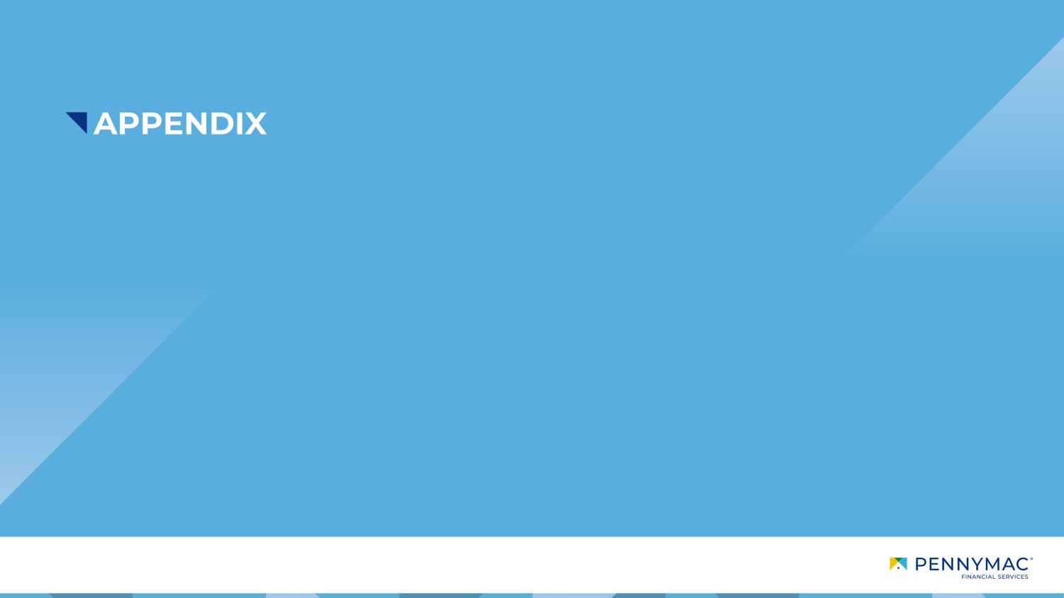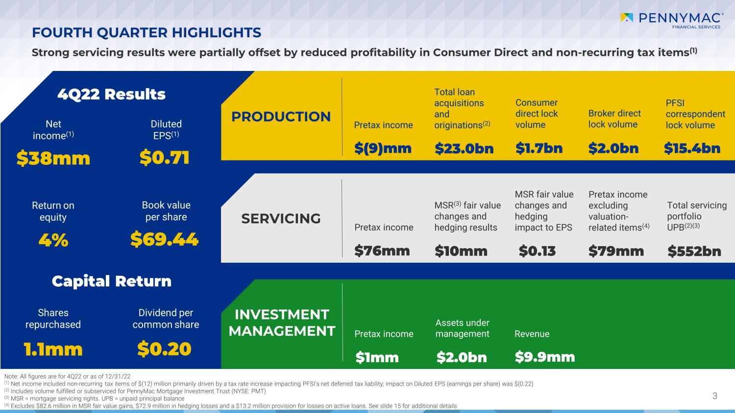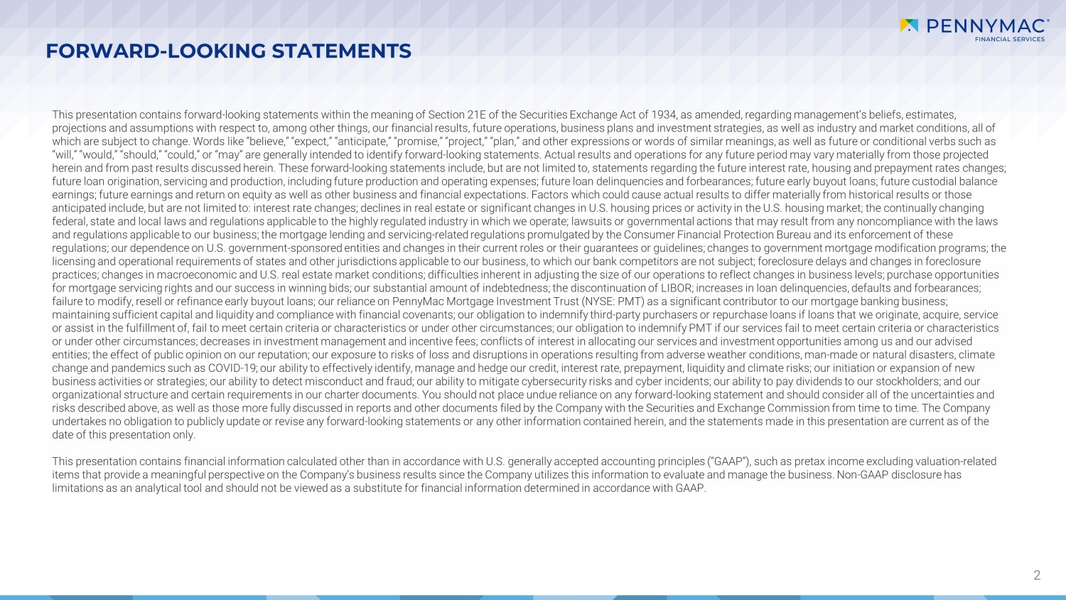 2 This presentation contains forward - looking statements within the meaning of Section 21E of the Securities Exchange Act of 1934, as amended, regarding management’s beliefs, estimates, projections and assumptions with respect to, among other things, our financial results, future operations, business plans and in vestment strategies, as well as industry and market conditions, all of which are subject to change. Words like “believe,” “expect,” “anticipate,” “promise,” “project,” “plan,” and other expression s o r words of similar meanings, as well as future or conditional verbs such as “will,” “would,” “should,” “could,” or “may” are generally intended to identify forward - looking statements. Actual results and o perations for any future period may vary materially from those projected herein and from past results discussed herein. These forward - looking statements include, but are not limited to, statements rega rding the future interest rate, housing and prepayment rates changes; future loan origination, servicing and production, including future production and operating expenses; future loan delinquenc ies and forbearances; future early buyout loans; future custodial balance earnings; future earnings and return on equity as well as other business and financial expectations. Factors which could caus e a ctual results to differ materially from historical results or those anticipated include, but are not limited to: interest rate changes; declines in real estate or significant changes in U.S. ho usi ng prices or activity in the U.S. housing market; the continually changing federal, state and local laws and regulations applicable to the highly regulated industry in which we operate; lawsuits or go ver nmental actions that may result from any noncompliance with the laws and regulations applicable to our business; the mortgage lending and servicing - related regulations promulgated by the Consumer F inancial Protection Bureau and its enforcement of these regulations; our dependence on U.S. government - sponsored entities and changes in their current roles or their guarantees or guid elines; changes to government mortgage modification programs; the licensing and operational requirements of states and other jurisdictions applicable to our business, to which our bank compet ito rs are not subject; foreclosure delays and changes in foreclosure practices; changes in macroeconomic and U.S. real estate market conditions; difficulties inherent in adjusting the size of ou r o perations to reflect changes in business levels; purchase opportunities for mortgage servicing rights and our success in winning bids; our substantial amount of indebtedness; the discontinuation of LI BOR; increases in loan delinquencies, defaults and forbearances; failure to modify, resell or refinance early buyout loans; our reliance on PennyMac Mortgage Investment Trust (NYSE: PMT) as a significant contributor to our mortgage banking business; maintaining sufficient capital and liquidity and compliance with financial covenants; our obligation to indemnify third - party pu rchasers or repurchase loans if loans that we originate, acquire, service or assist in the fulfillment of, fail to meet certain criteria or characteristics or under other circumstances; our obligatio n t o indemnify PMT if our services fail to meet certain criteria or characteristics or under other circumstances; decreases in investment management and incentive fees; conflicts of interest in allocating our ser vices and investment opportunities among us and our advised entities; the effect of public opinion on our reputation; our exposure to risks of loss and disruptions in operations resulti ng from adverse weather conditions, man - made or natural disasters, climate change and pandemics such as COVID - 19; our ability to effectively identify, manage and hedge our credit, interest rate, prepayme nt, liquidity and climate risks; our initiation or expansion of new business activities or strategies; our ability to detect misconduct and fraud; our ability to mitigate cybersecurity risks an d c yber incidents; our ability to pay dividends to our stockholders; and our organizational structure and certain requirements in our charter documents. You should not place undue reliance on any forwar d - l ooking statement and should consider all of the uncertainties and risks described above, as well as those more fully discussed in reports and other documents filed by the Company with the Sec uri ties and Exchange Commission from time to time. The Company undertakes no obligation to publicly update or revise any forward - looking statements or any other information contained herein, and the statements made in this presentation are current as of the date of this presentation only. This presentation contains financial information calculated other than in accordance with U.S. generally accepted accounting pri nciples (“GAAP”), such as pretax income excluding valuation - related items that provide a meaningful perspective on the Company’s business results since the Company utilizes this information to eva luate and manage the business. Non - GAAP disclosure has limitations as an analytical tool and should not be viewed as a substitute for financial information determined in accordance wi th GAAP. FORWARD - LOOKING STATEMENTS