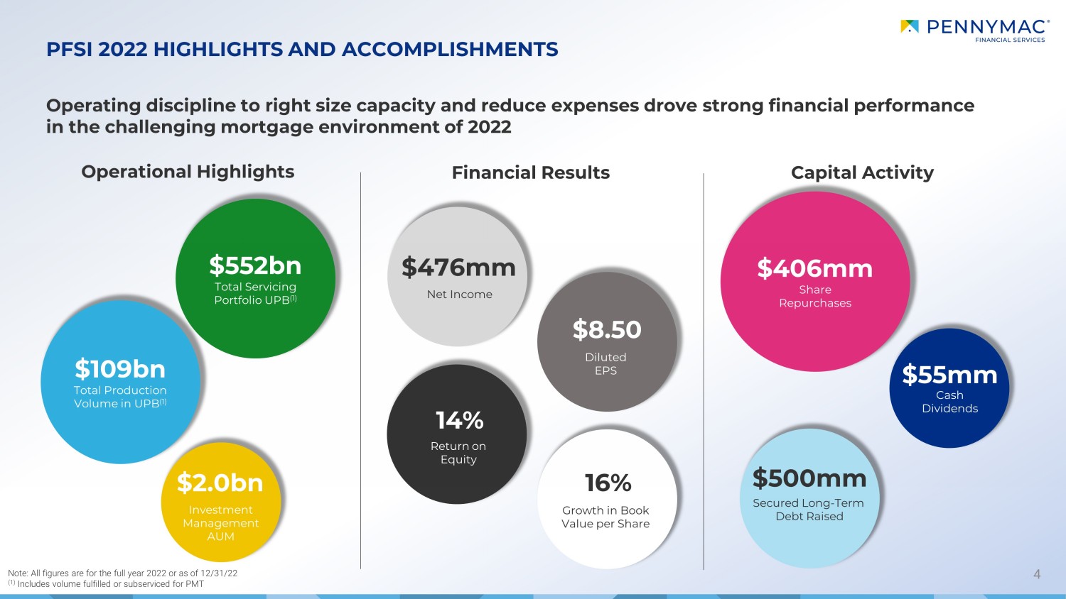 FOURTH QUARTER HIGHLIGHTS 3 3 PRODUCTION INVESTMENT MANAGEMENT Net income (1) $38mm 4Q22 Results Diluted EPS (1) $0.71 Return on equity 4 % Book value per share $ 69.44 Capital Return Shares repurchased 1.1mm Dividend per common share $0.20 Pretax income $(9)mm $1.7bn PFSI correspondent lock volume $15.4bn Broker direct lock volume $2.0bn $23.0bn Pretax income $1mm Assets under management $2.0bn Revenue $9.9mm Note: All figures are for 4Q22 or as of 12/31/22 (1) Net income included non - recurring tax items of $(12) million primarily driven by a tax rate increase impacting PFSI’s net deferred tax liability; impact on Diluted EPS (earnings per share) was $( 0.22 ) (2) Includes volume fulfilled or subserviced for PennyMac Mortgage Investment Trust (NYSE: PMT) (3 ) MSR = mortgage servicing rights. UPB = unpaid principal balance (4) Excludes $82.6 million in MSR fair value gains, $72.9 million in hedging losses and a $13.2 million provision for losses on a ct ive loans. See slide 15 for additional details SERVICING Pretax income $76mm MSR (3) fair value changes and hedging results $10mm Pretax income excluding valuation - related items (4) $79mm MSR fair value changes and hedging impact to EPS $0.13 Total servicing portfolio UPB (2)(3 ) $552bn Total loan acquisitions and originations (2) Consumer direct lock volume Strong servicing results were partially offset by reduced profitability in Consumer Direct and non - recurring tax items (1)