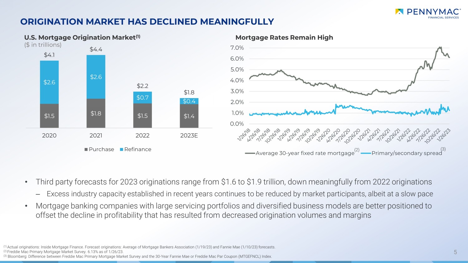 4 PFSI 2022 HIGHLIGHTS AND ACCOMPLISHMENTS Note: All figures are for the full year 2022 or as of 12/31/22 (1) Includes volume fulfilled or subserviced for PMT $109bn Total Production Volume in UPB (1) $552bn Total Servicing Portfolio UPB (1) Investment Management AUM Operational Highlights Financial Results Capital Activity $2.0bn Net Income $476mm Diluted EPS $8.50 Growth in Book Value per Share 16% Return on Equity 14% $406mm Share Repurchases Cash Dividends $55mm $500mm Secured Long - Term D ebt R aised Operating discipline to right size capacity and reduce expenses drove strong financial performance in the challenging mortgage environment of 2022