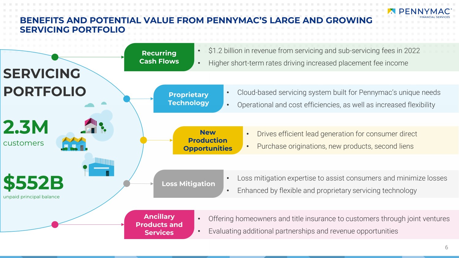 5 ORIGINATION MARKET HAS DECLINED MEANINGFULLY U.S. Mortgage Origination Market (1) ($ in trillions) Mortgage Rates Remain High • Third party forecasts for 2023 originations range from $ 1.6 to $1.9 trillion, down meaningfully from 2022 originations ‒ Excess industry capacity established in recent years continues to be reduced by market participants, albeit at a slow pace • Mortgage banking companies with large servicing portfolios and diversified business models are better positioned to offset the decline in profitability that has resulted from decreased origination volumes and margins (1) Actual originations: Inside Mortgage Finance. F orecast originations: Average of Mortgage Bankers Association ( 1 /19/23) and Fannie Mae ( 1 /10/23) forecasts. (2) Freddie Mac Primary Mortgage Market Survey. 6.13 % as of 1/26/23. (3) Bloomberg: Difference between Freddie Mac Primary Mortgage Market Survey and the 30 - Year Fannie Mae or Freddie Mac Par Coupon ( MTGEFNCL) Index. (2) (3) $1.5 $1.8 $1.5 $1.4 $2.6 $2.6 $0.7 $0.4 $4.1 $4.4 $2.2 $1.8 2020 2021 2022 2023E Purchase Refinance 0.0% 1.0% 2.0% 3.0% 4.0% 5.0% 6.0% 7.0% Average 30-year fixed rate mortgage Primary/secondary spread
