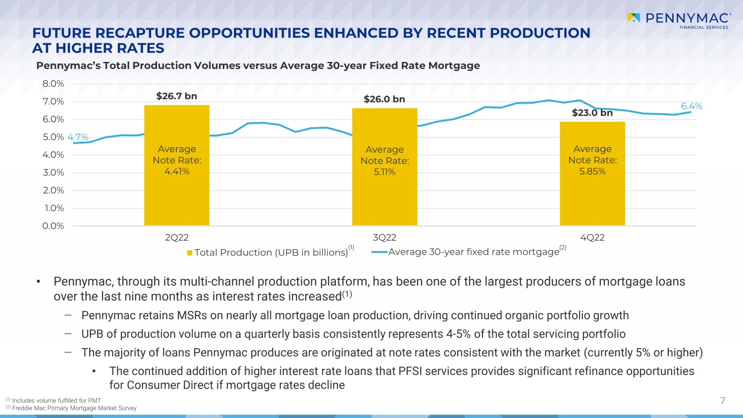 • Offering homeowners and title insurance to customers through joint ventures • Evaluating additional partnerships and revenue opportunities 6 • $1.2 billion in revenue from servicing and sub - servicing fees in 2022 • Higher short - term rates driving increased placement fee income • Cloud - based servicing system built for Pennymac’s unique needs • Operational and cost efficiencies, as well as increased flexibility • Drives efficient lead generation for consumer direct • Purchase originations, new products, second liens • Loss mitigation expertise to assist consumers and minimize losses • Enhanced by flexible and proprietary servicing technology BENEFITS AND POTENTIAL VALUE FROM PENNYMAC’S LARGE AND GROWING SERVICING PORTFOLIO SERVICING PORTFOLIO Recurring Cash Flows Proprietary Technology New Production Opportunities Loss Mitigation Ancillary Products and Services 2.3M customers $5 52 B unpaid principal balance