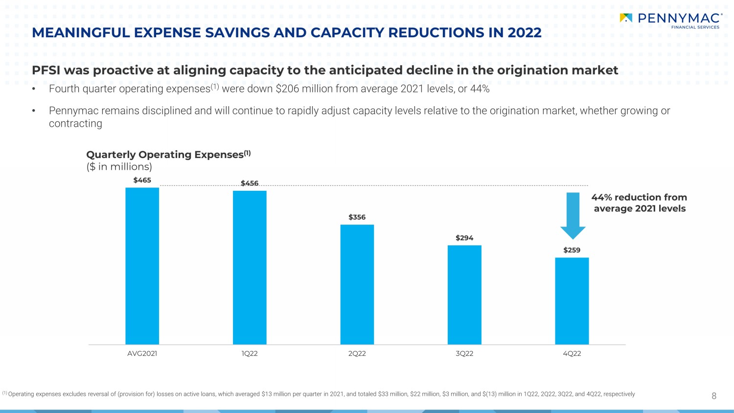 4.7% 6.4% 0.0% 1.0% 2.0% 3.0% 4.0% 5.0% 6.0% 7.0% 8.0% Average 30-year fixed rate mortgage $26.7 bn $26.0 bn $23.0 bn 2Q22 3Q22 4Q22 Total Production (UPB in billions) Pennymac’s Total Production Volumes versus Average 30 - year Fixed Rate Mortgage FUTURE RECAPTURE OPPORTUNITIES ENHANCED BY RECENT PRODUCTION AT HIGHER RATES 7 • Pennymac , through its multi - channel production platform, has been one of the largest producers of mortgage loans over the last nine months as interest rates increased (1) ‒ Pennymac retains MSRs on nearly all mortgage loan production, driving continued organic portfolio growth ‒ UPB of production volume on a quarterly basis consistently represents 4 - 5% of the total servicing portfolio ‒ The majority of loans Pennymac produces a re originated at note rates consistent with the market (currently 5% or higher) • The continued addition of higher interest rate loans that PFSI services provides significant refinance opportunities for Consumer Direct if mortgage rates decline (1) Includes volume fulfilled for PMT (2) Freddie Mac Primary Mortgage Market Survey (2) (1) Average Note Rate: 4.41% Average Note Rate: 5.11% Average Note Rate: 5.85%
