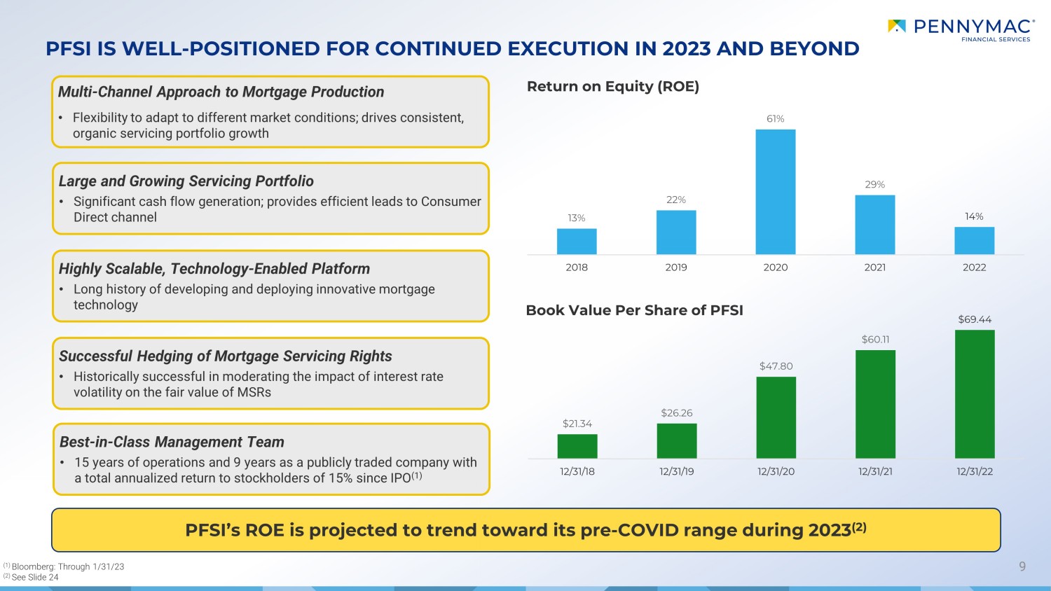 $465 $456 $356 $294 $259 AVG2021 1Q22 2Q22 3Q22 4Q22 Quarterly Operating Expenses (1) ($ in millions) 8 MEANINGFUL EXPENSE SAVINGS AND CAPACITY REDUCTIONS IN 2022 PFSI was proactive at aligning capacity to the anticipated decline in the origination market • Fourth quarter operating expenses (1) were down $206 million from average 2021 levels, or 44% • Pennymac remains disciplined and will continue to rapidly adjust capacity levels relative to the origination market, whether growing or contracting (1) Operating expenses excludes reversal of (provision for) losses on active loans, which averaged $13 million per quarter in 202 1, and totaled $33 million, $22 million, $3 million, and $(13) million in 1Q22, 2Q22, 3Q22, and 4Q22, respectively 44% reduction from average 2021 levels