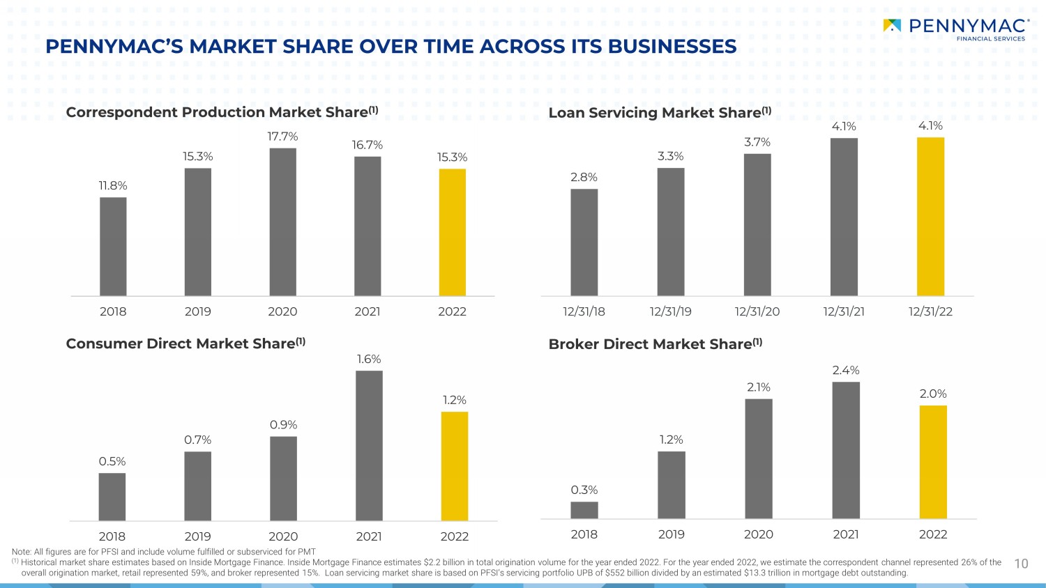 $21.34 $26.26 $47.80 $60.11 $69.44 12/31/18 12/31/19 12/31/20 12/31/21 12/31/22 13% 22% 61% 29% 14% 2018 2019 2020 2021 2022 9 PFSI IS WELL - POSITIONED FOR CONTINUED EXECUTION IN 2023 AND BEYOND Book Value Per Share of PFSI Return on Equity (ROE) PFSI’s ROE is projected to trend toward its pre - COVID range during 2023 (2) Multi - Channel Approach to Mortgage Production • Flexibility to adapt to different market conditions; drives consistent, organic servicing portfolio growth Large and Growing Servicing Portfolio • Significant cash flow generation; provides efficient leads to Consumer Direct channel Highly Scalable, Technology - Enabled Platform • Long history of developing and deploying innovative mortgage technology Successful Hedging of Mortgage Servicing Rights • Historically successful in moderating the impact of interest rate volatility on the fair value of MSRs Best - in - Class Management Team • 15 years of operations and 9 years as a publicly traded company with a total annualized return to stockholders of 15% since IPO (1) (1) Bloomberg : Through 1/31/23 (2) See Slide 24