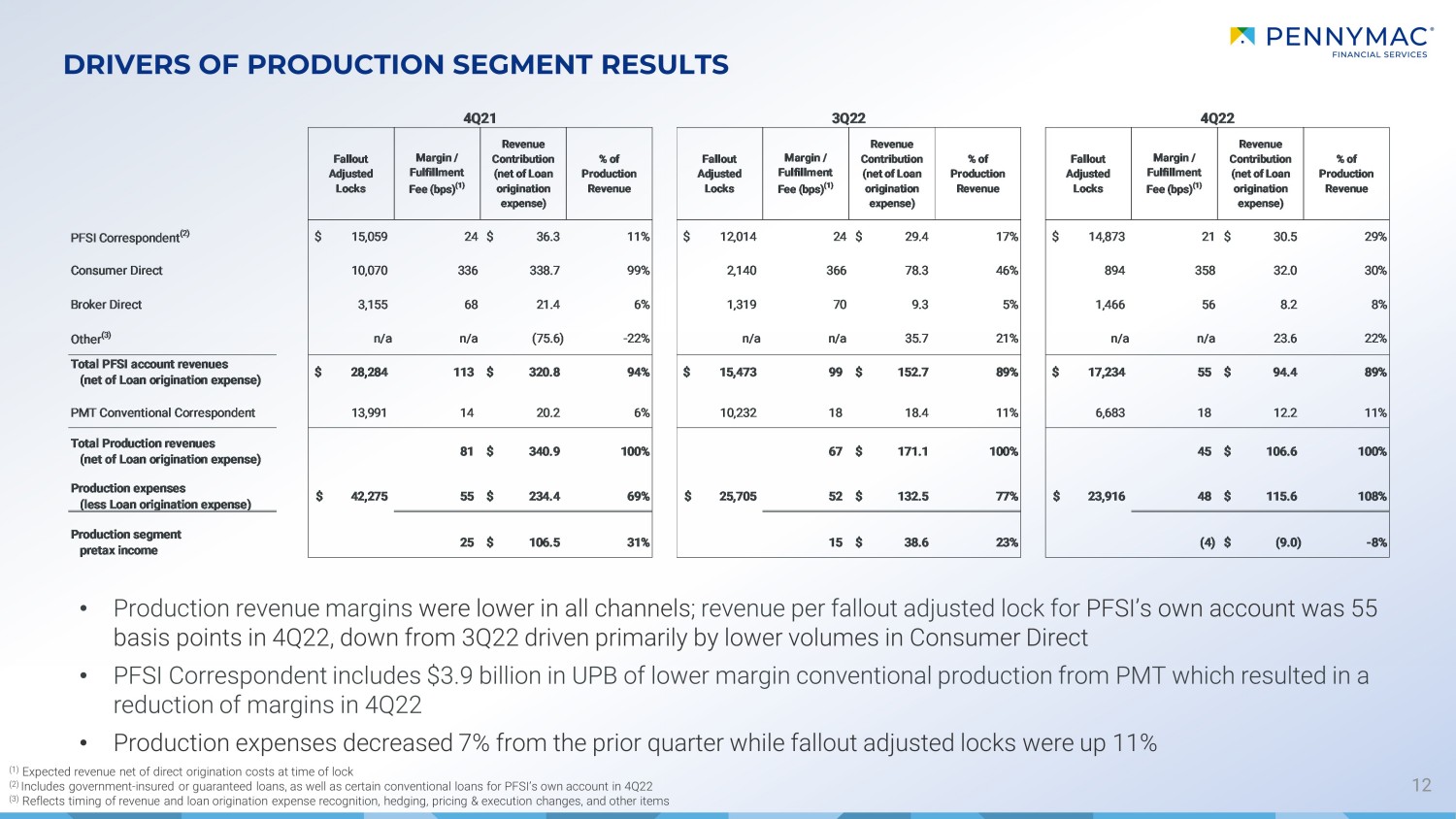 11 PRODUCTION SEGMENT HIGHLIGHTS – VOLUME BY CHANNEL Consumer Direct (UPB in billions) Broker Direct (UPB in billions) January 2023 January 2023 January 2023 Note: Figures may not sum due to rounding (1) For government - insured loans, PFSI earns income from holding and selling or securitizing the loans (2) Includes loans fulfilled for PMT as well as loans for PFSI’s own account. For loans fulfilled for PMT, PFSI earns a fulfillme nt fee from PMT rather than income from holding and selling or securitizing the loans (3) Includes locks related to PMT loan acquisitions as well as loans for which PFSI earns a fulfillment fee (4) Commitments to originate mortgage loans at specified terms at period end (1) (2) (3) Correspondent (UPB in billions) $4.3 $1.1 $0.6 $6.3 $1.2 $0.5 $10.6 $2.3 $1.1 $14.2 $3.8 $1.7 4Q21 3Q22 4Q22 Government loans Conventional loans Total locks $0.9 $0.4 $0.4 $2.8 $0.9 $0.8 $3.7 $1.3 $1.1 $3.9 $1.9 $2.0 4Q21 3Q22 4Q22 Government loans Conventional loans Total locks $15.7 $12.2 $10.1 $17.2 $10.2 $10.7 $32.8 $22.4 $20.8 $30.3 $23.0 $22.9 4Q21 3Q22 4Q22 Government loans Conventional loans Total locks Locks: (UPB in billions) $6.1 Locks: (UPB in billions) $0.7 Locks: (UPB in billions) $0.8 Acquisitions: (UPB in billions) $6.8 Originations: (UPB in billions) $0.2 Originations: (UPB in billions) $0.5 Committed pipeline (4) : (UPB in billions) $0.7 Committed pipeline (4) : (UPB in billions) $0.8